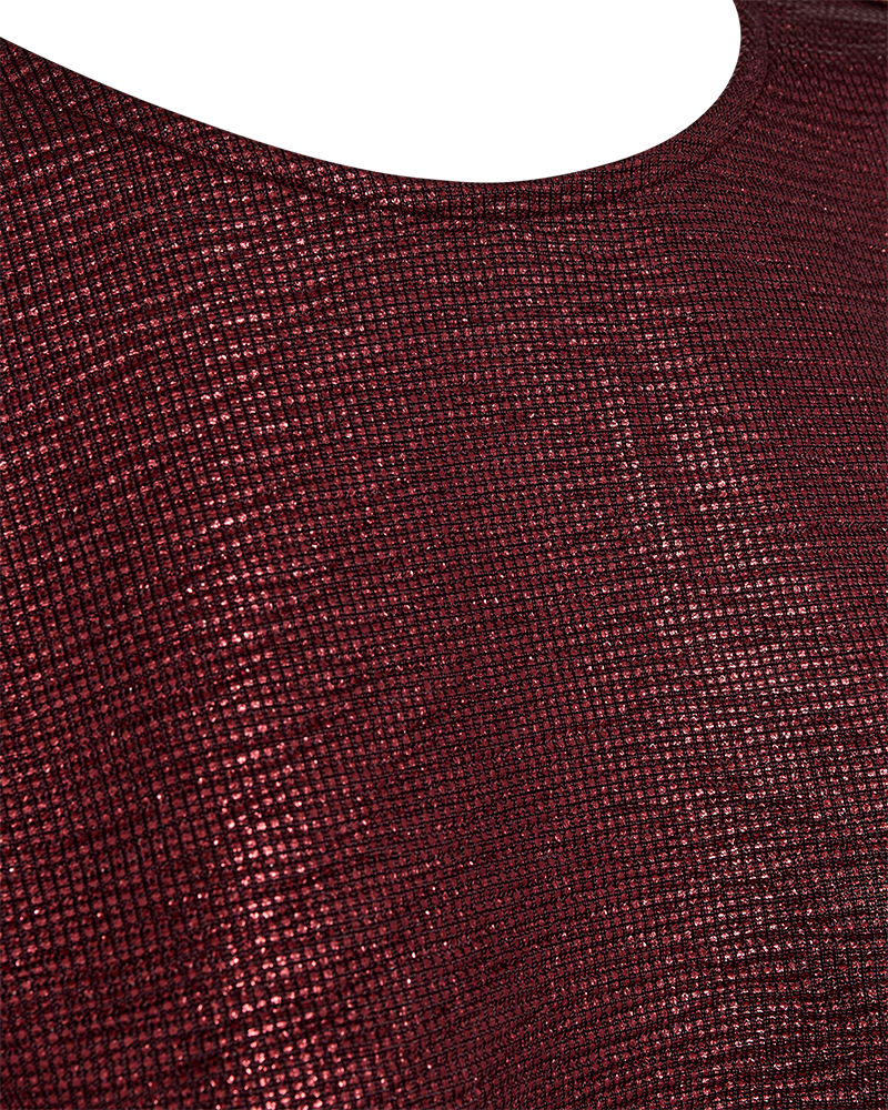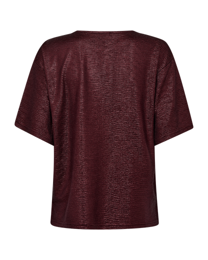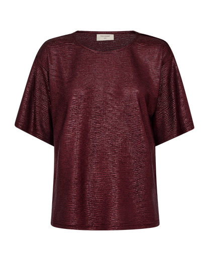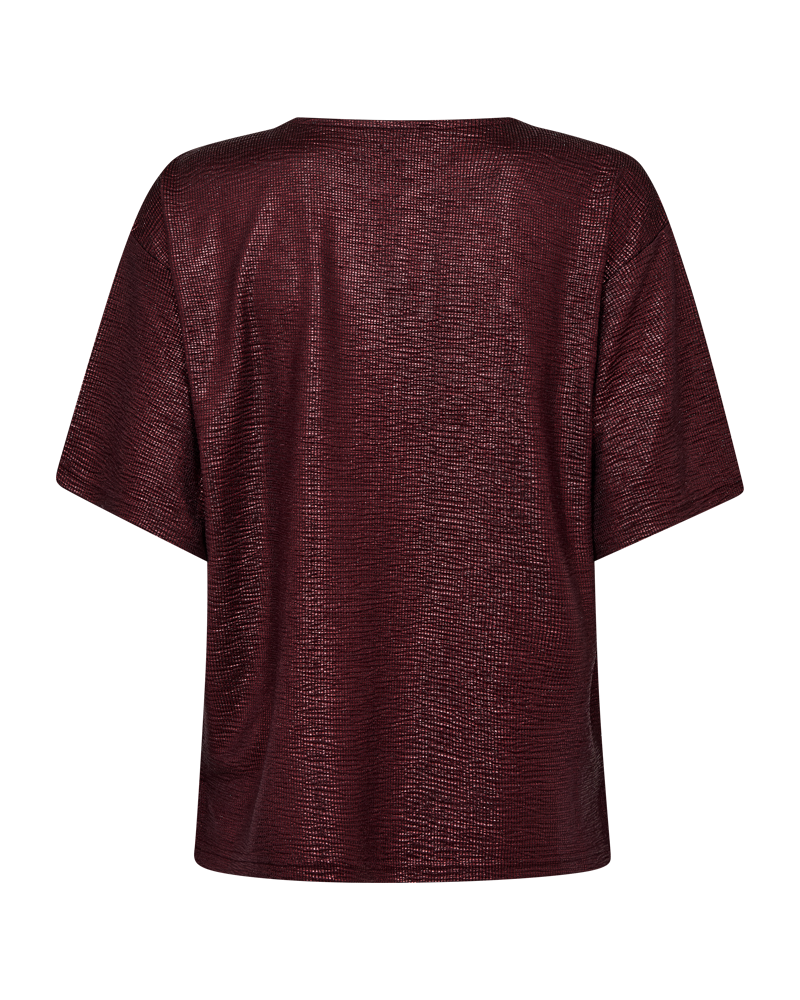 Mangler du en glimmerbluse til julefrokosten? Den fine bluse fra Freequent har korte ærmer og er lavet en vinrød farve. Perfekt til dine sorte skindbukser eller en fin nederdel.