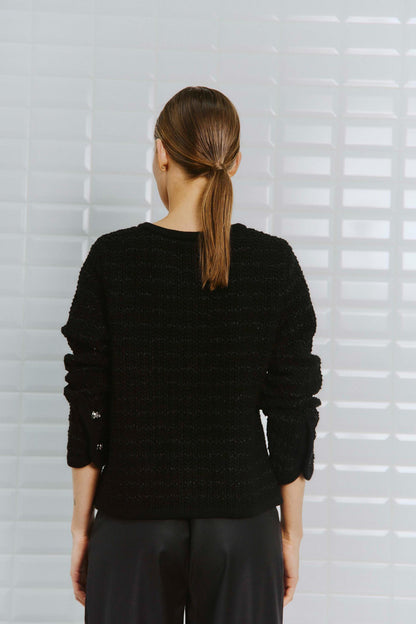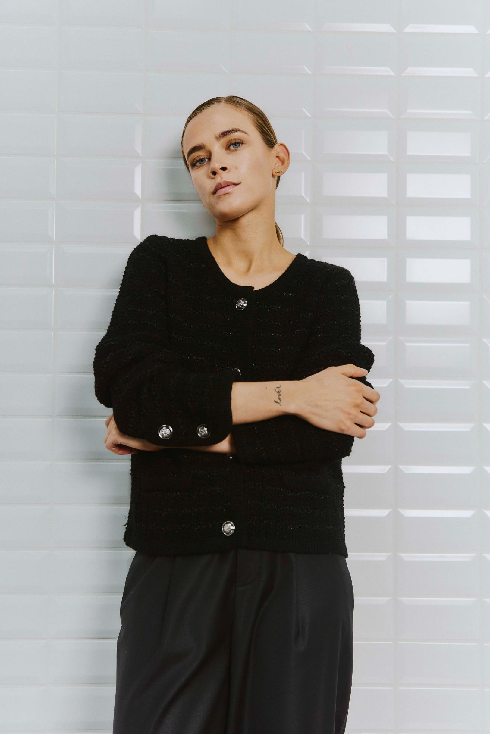 Lækker cardigan i sort med fed struktur. Cardiganen har et firkantet snit, så den bliver eksklusiv at se på. Der er lidt uld i materialet, så du også kan holde varmen. Super flot til dine sorte jeans eller skindbukser.