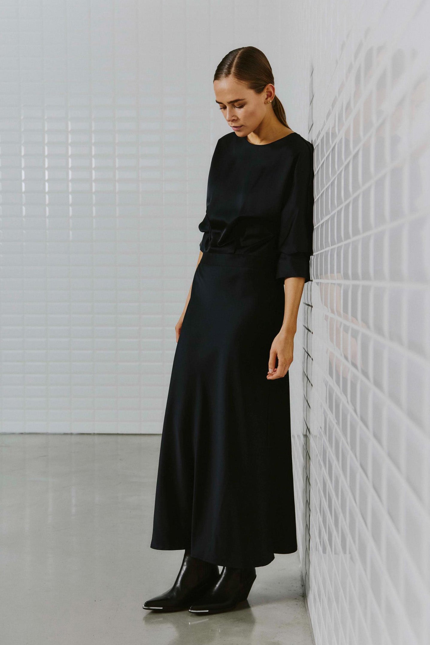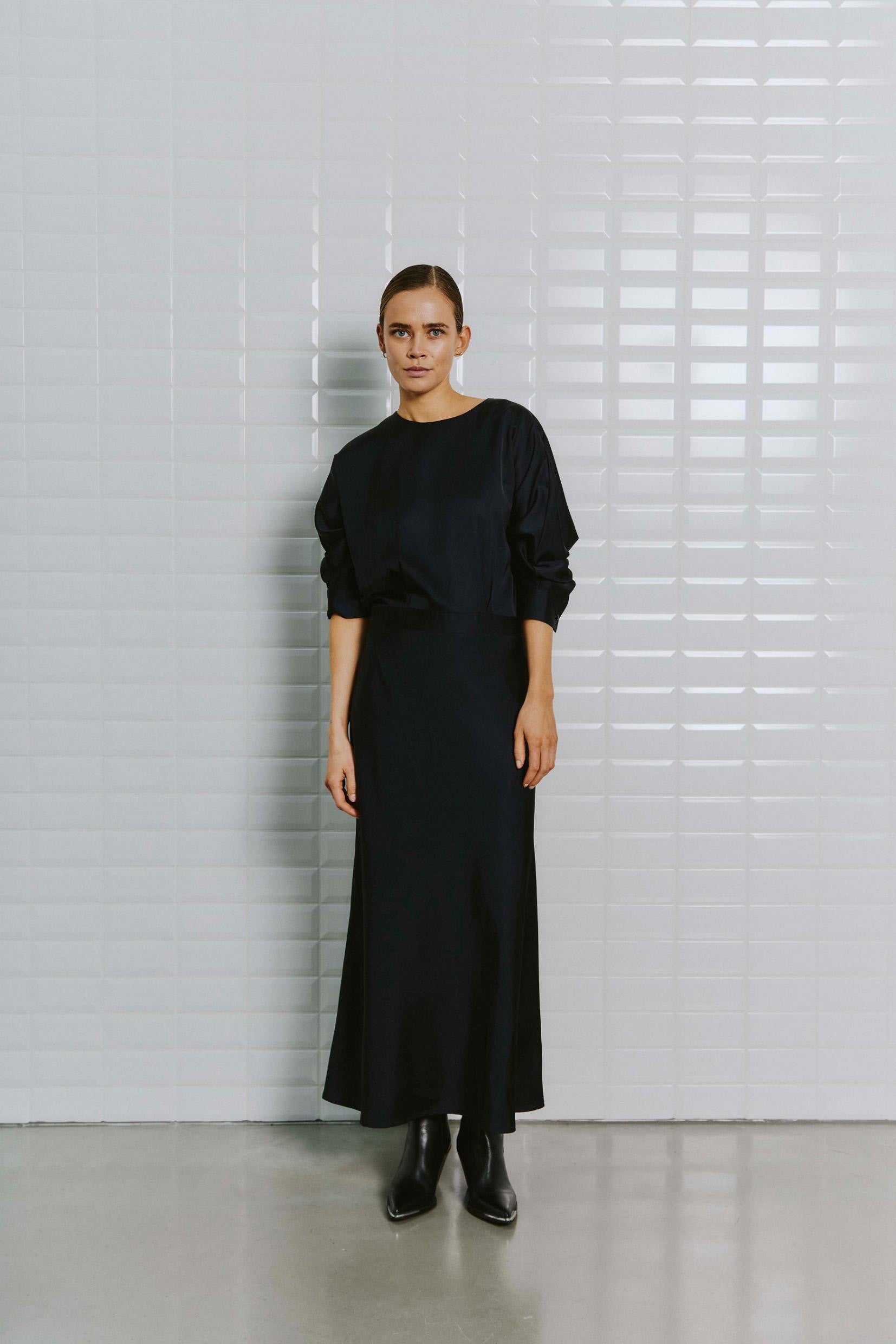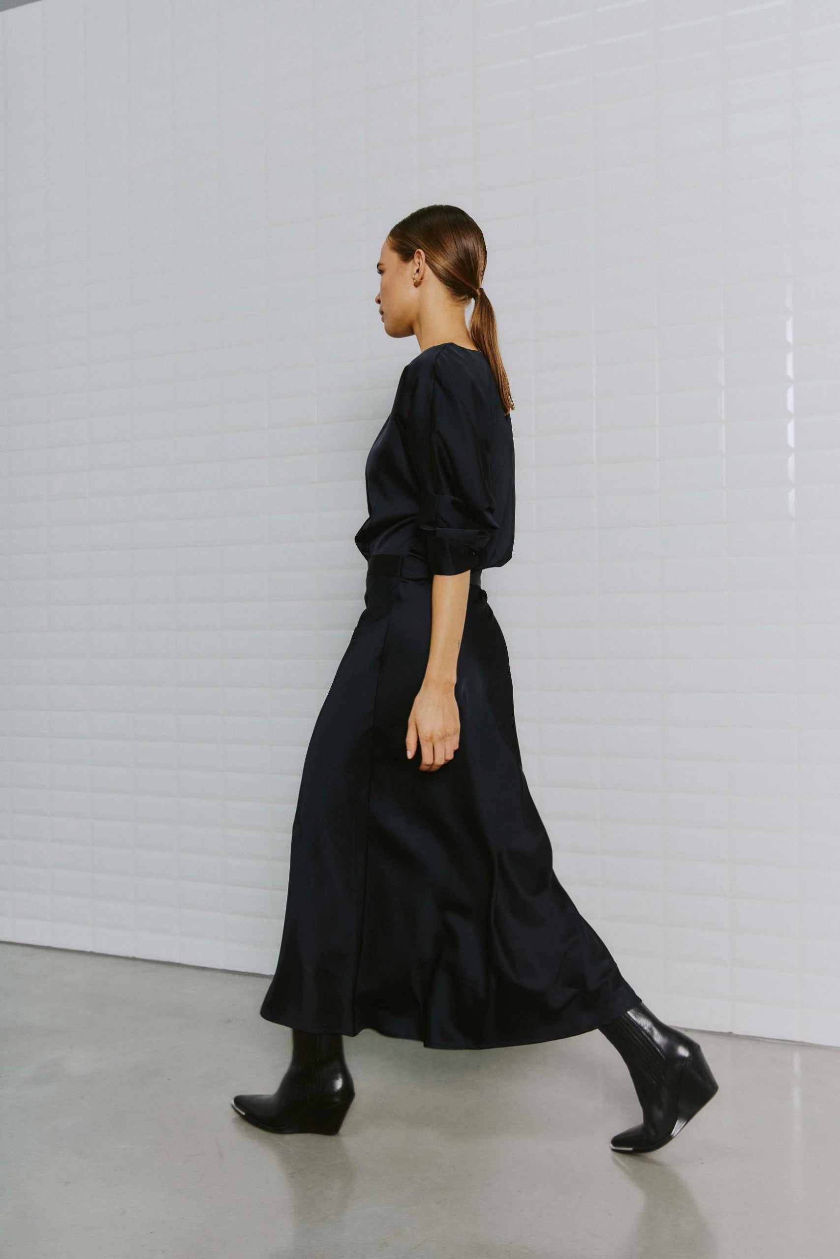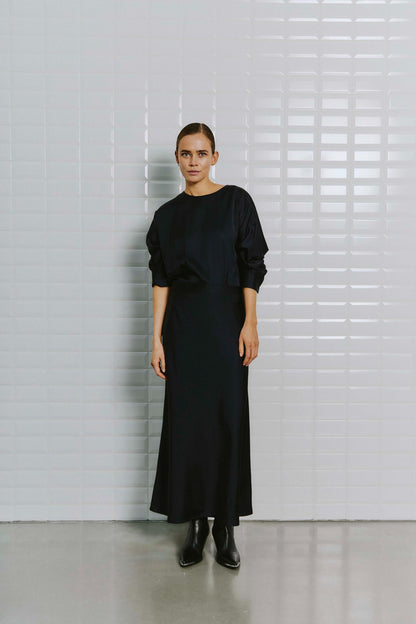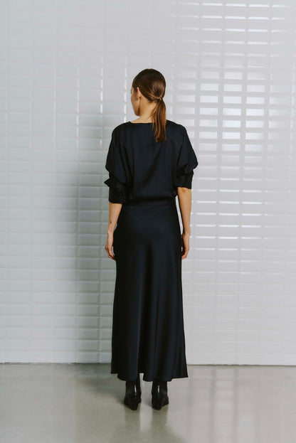 Elegant mørkeblå kjole i blank satin. Kjolen har et taljeret look foroven og fin vidde i skørtet. Den høje slids bagpå sikrer et festligt look. Style med dine fine stiletter eller sandaler og bliv klar til de kommende fester.