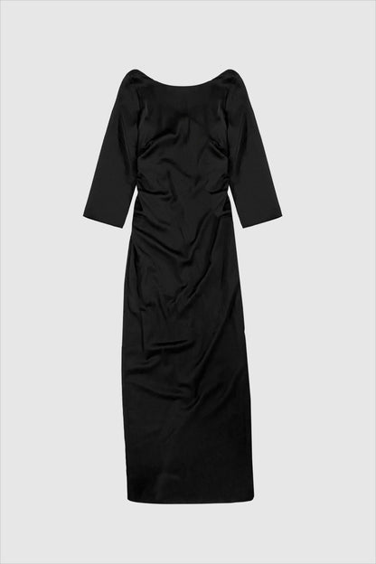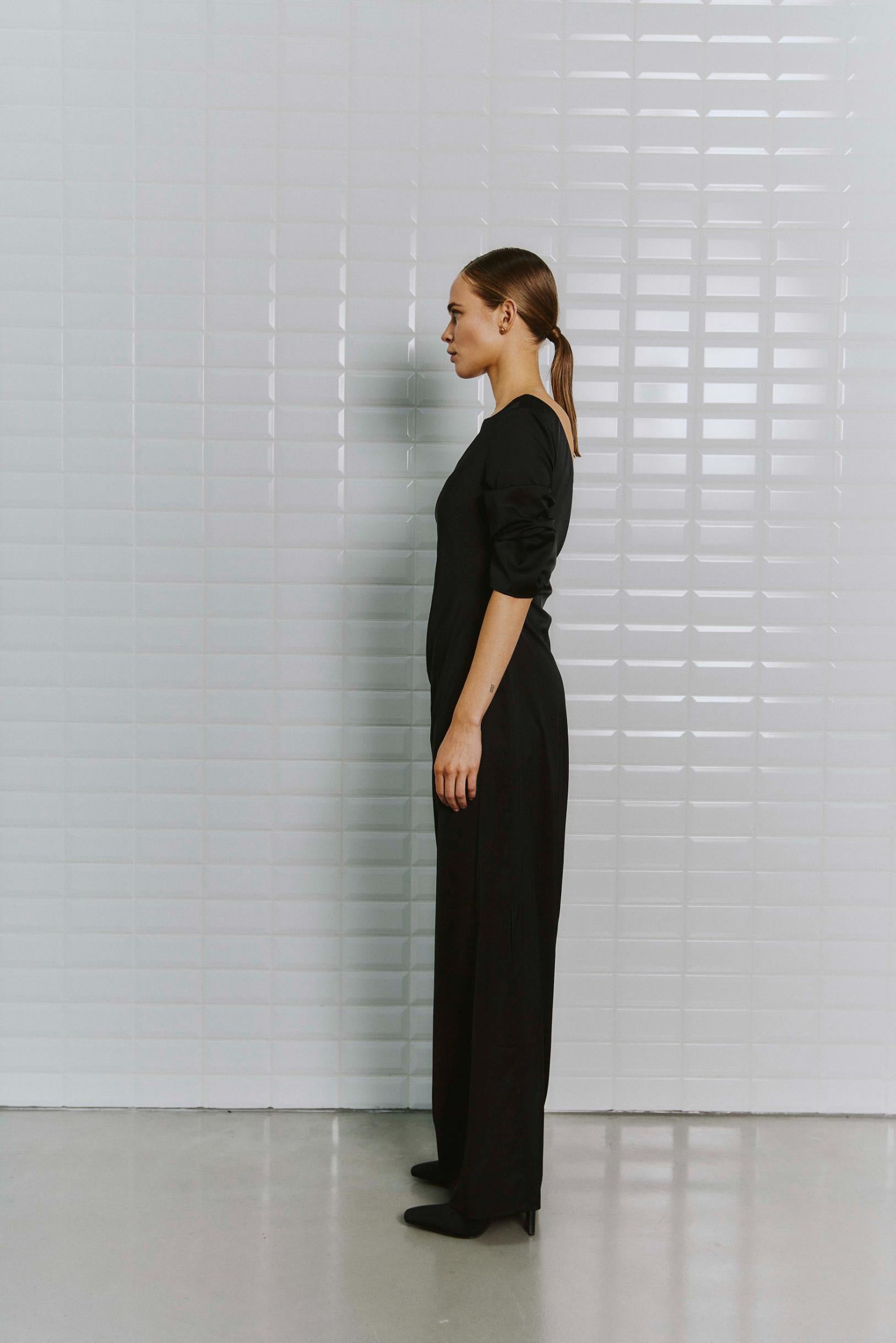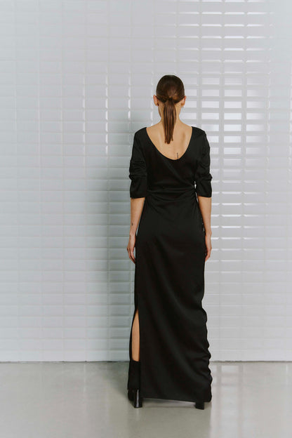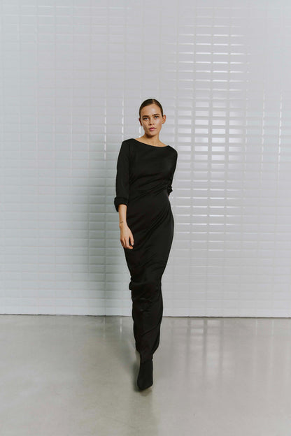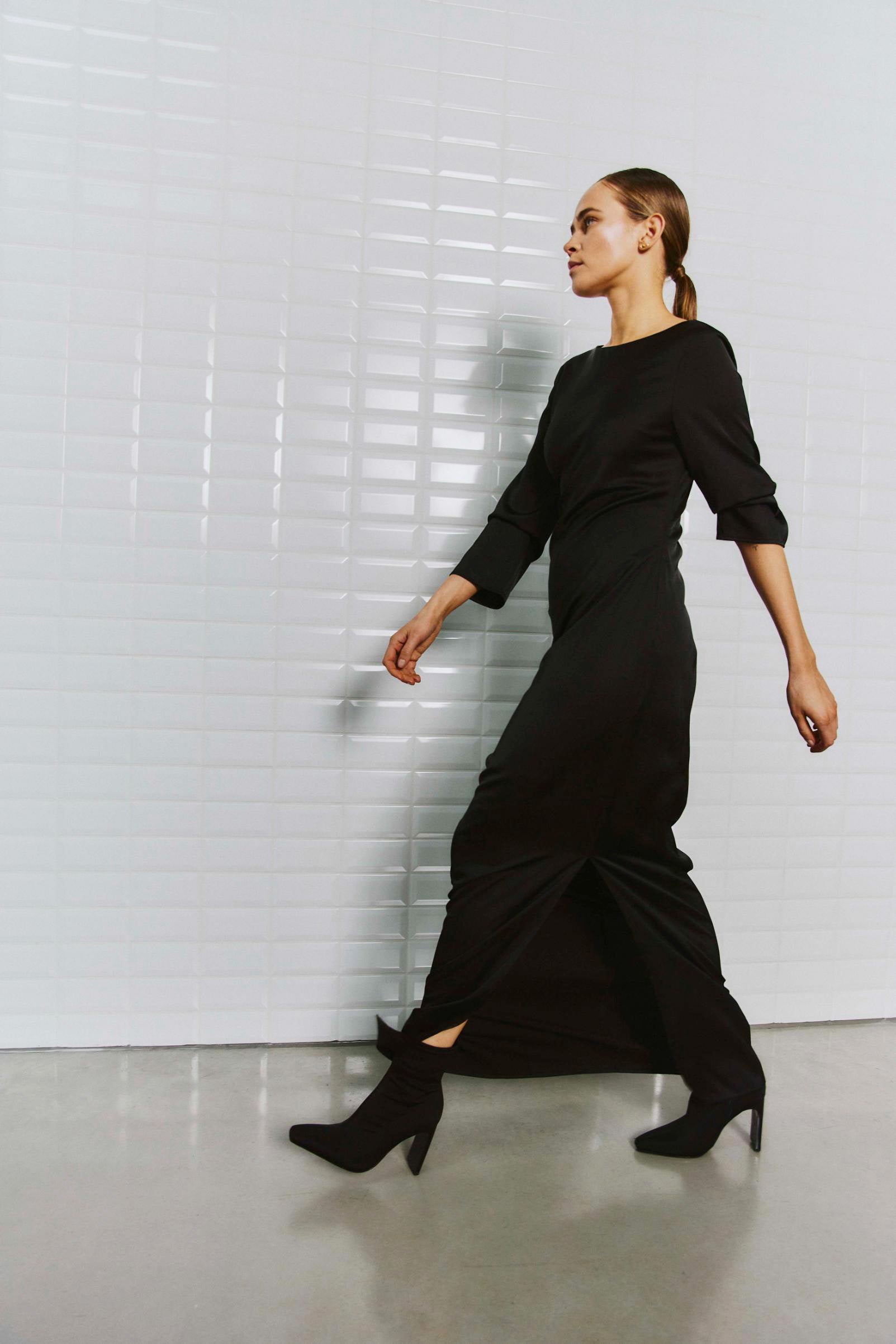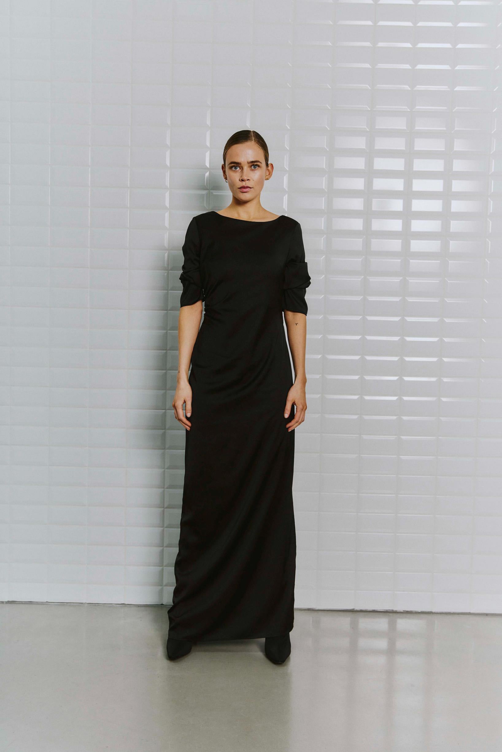 Lang, sort kjole fra WithBlack med 3/4 lange ærmer. Kjolen har bådudskæring ved haludskæringen og høj slids i siden. Pasformen er tætsiddende og har du en stor barm, skal du gå en størrelse op, da kjolen ellers bliver for stram over brystet.