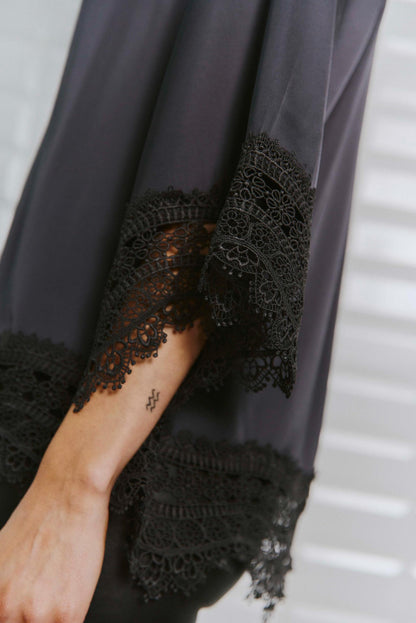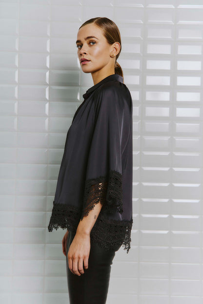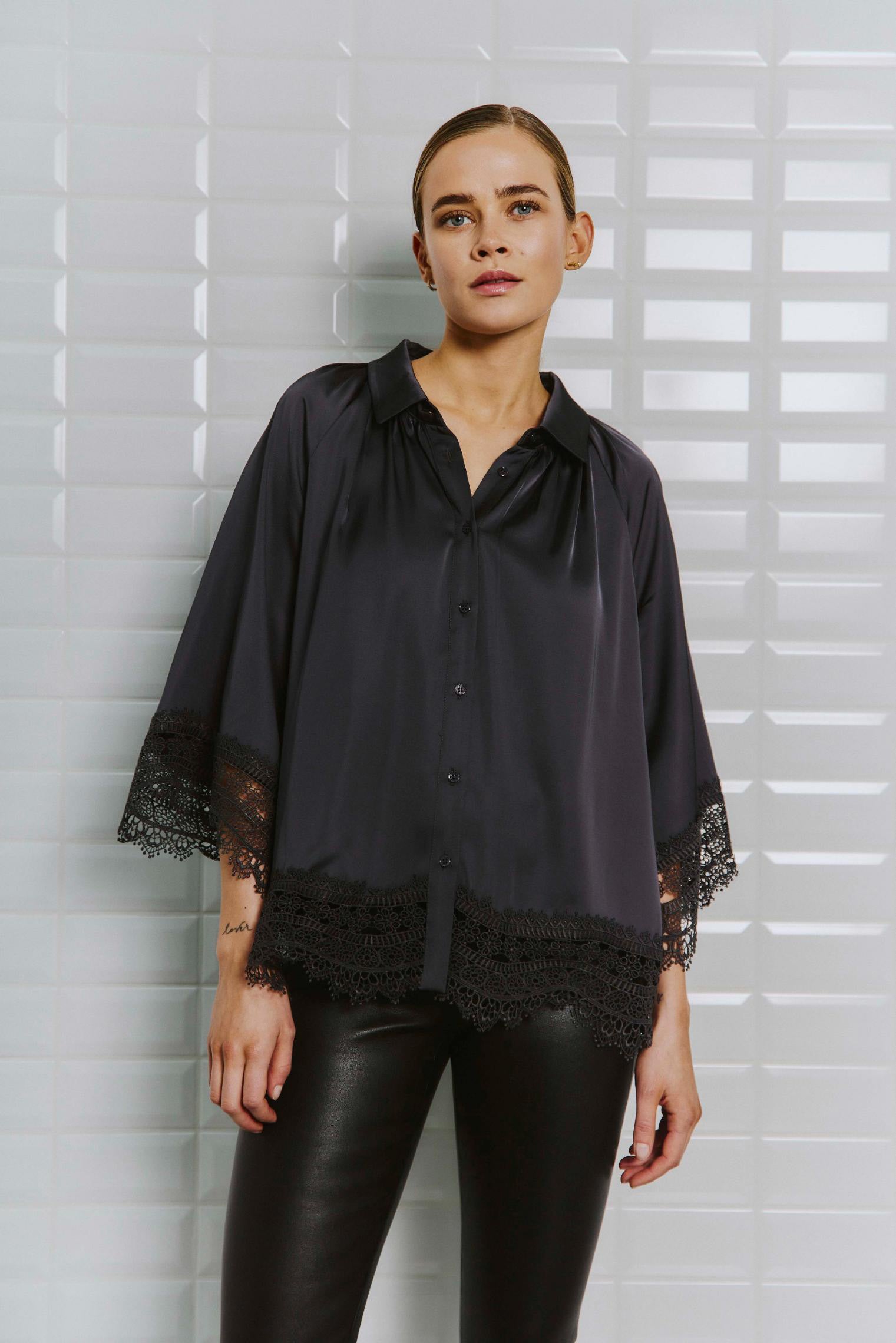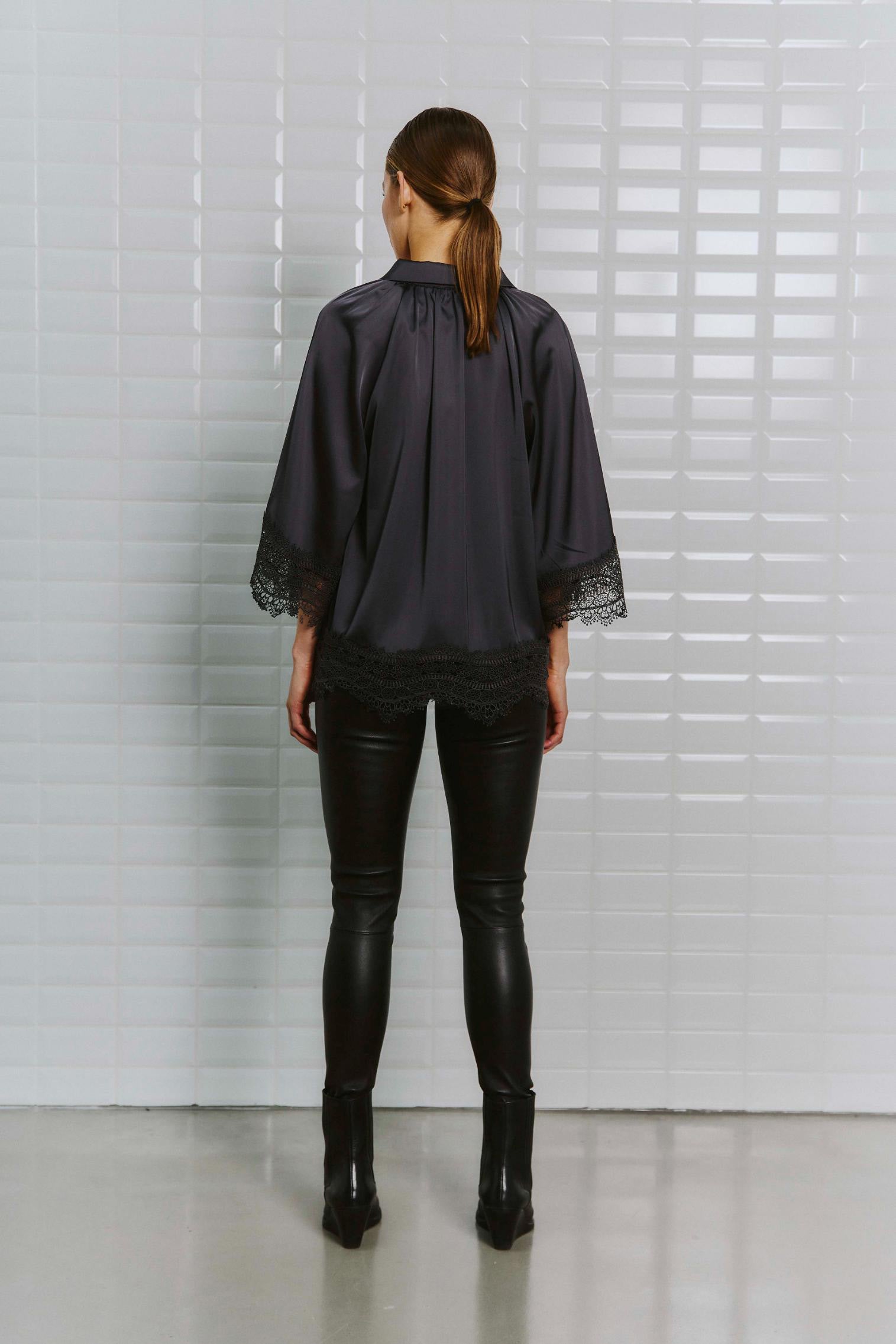 Elegant skjorte fra With Black i mørkegrå viskoseblanding. Skjorten har et boxy snit med feminin blondekant ved manchetterne samt i bunden. Ærmerne har en god vidde og er lavet i 3/4 længde, så dit look bliver mere festligt. Style med de matchende Dagmar bukser, hvis du gerne vil have et helt sæt, der passer sammen.
