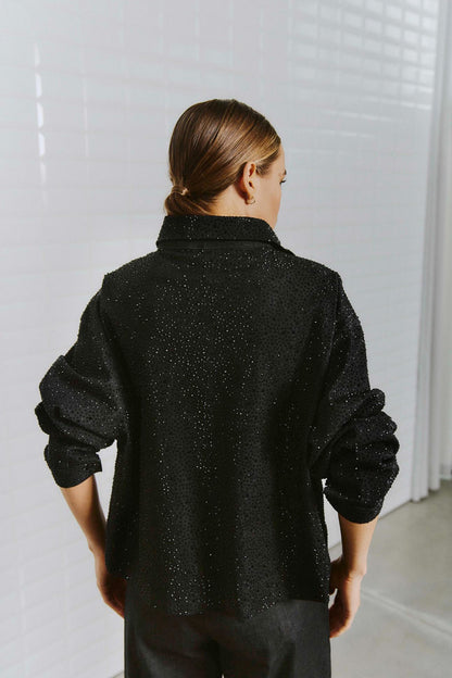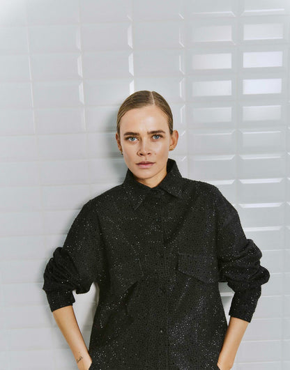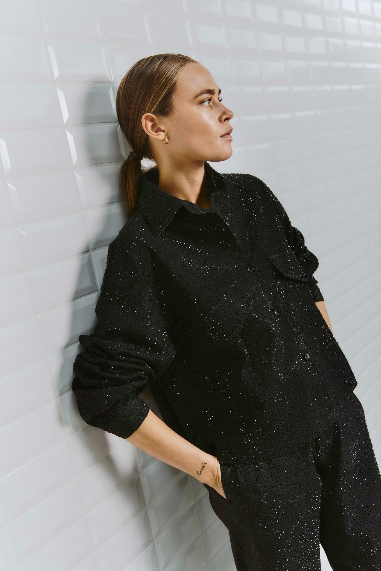Fed indendørsjakke i sort denim. Jakken er coated med sorte sten, som giver et både festligt og råt look. Der er lommer på brystet og flot krave. Style jakken som modellen gør, hvor du lige smøger ærmerne lidt op, så dit outfit får lidt mere kant.
