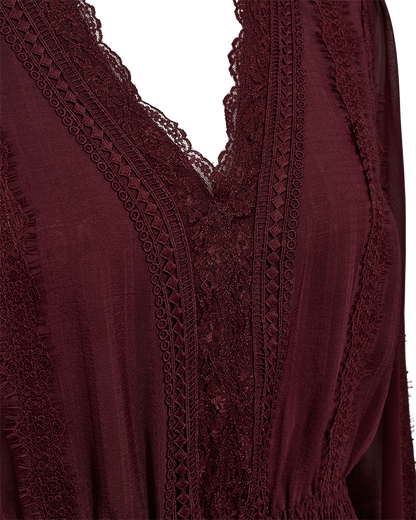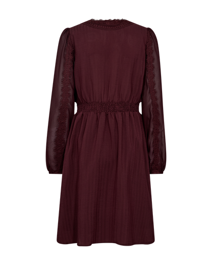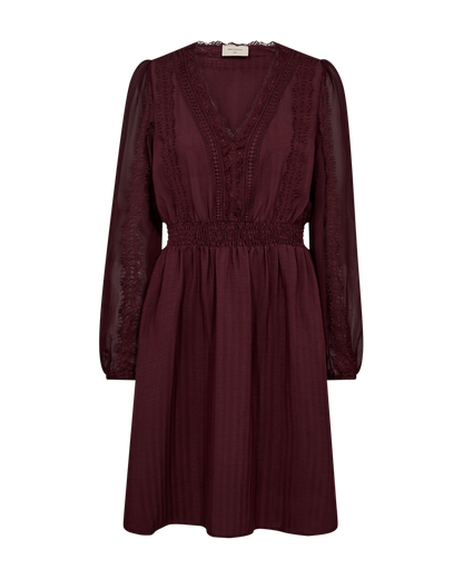 Sød viskosekjole fra Freequent i en flot bordeaux farve. Kjolen har blonder i halsudskæringen og et taljeret snit, så du får en flot figur. Style med dine høje støvler.