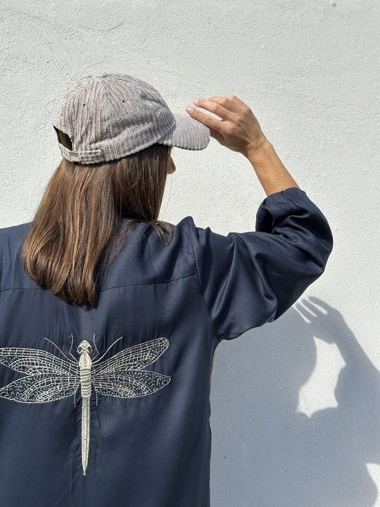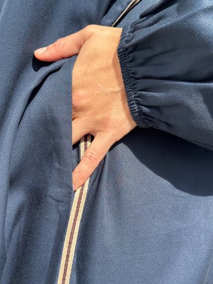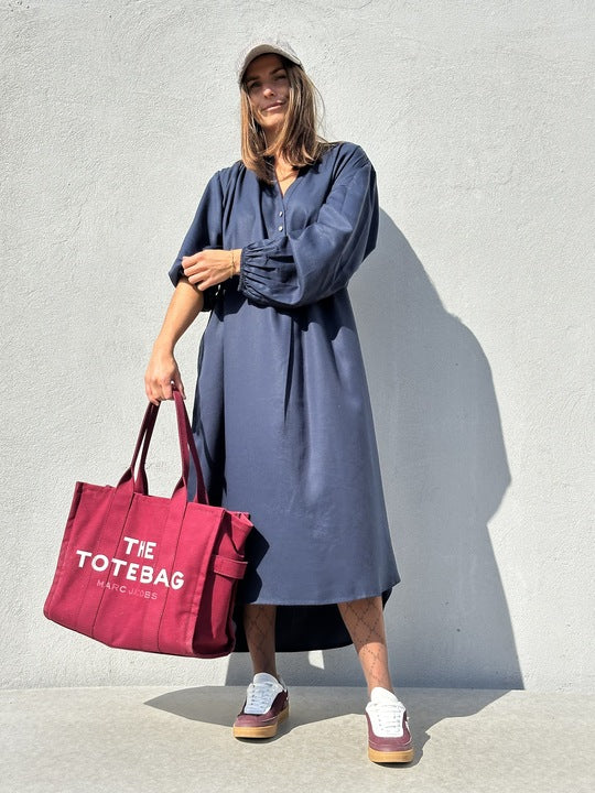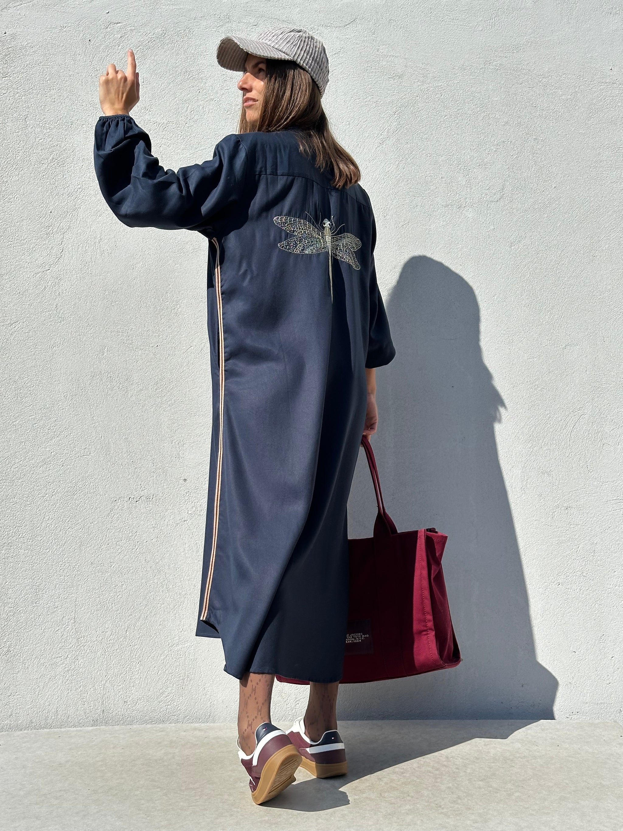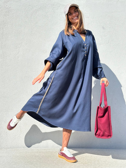 Skøn kjole fra Gaspar i mørkeblå tencel. Kjolen har en løs pasform med store ballonærmer. Bagpå ses et broderi af den ikoniske guldsmed og ned langs siderne finder du gyldne galoner, som giver et mere sporty look. Materialet minder om lyocell og minder altså om en blød denim.