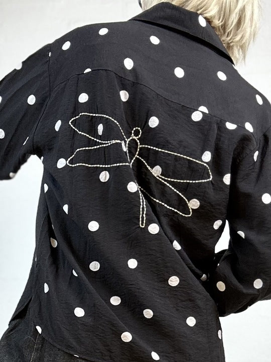 Figursyet skjorte fra Gaspar i sort viskose. Skjorten har hvide polkaprikker og den fine guldsmed på ryggen. Style til dine jeans eller til sorte bukser. Polkaprikker er et hit denne sæson, så kast dig bare over trenden.