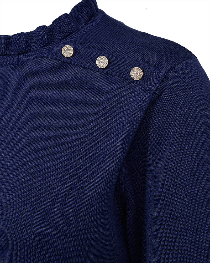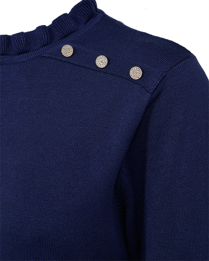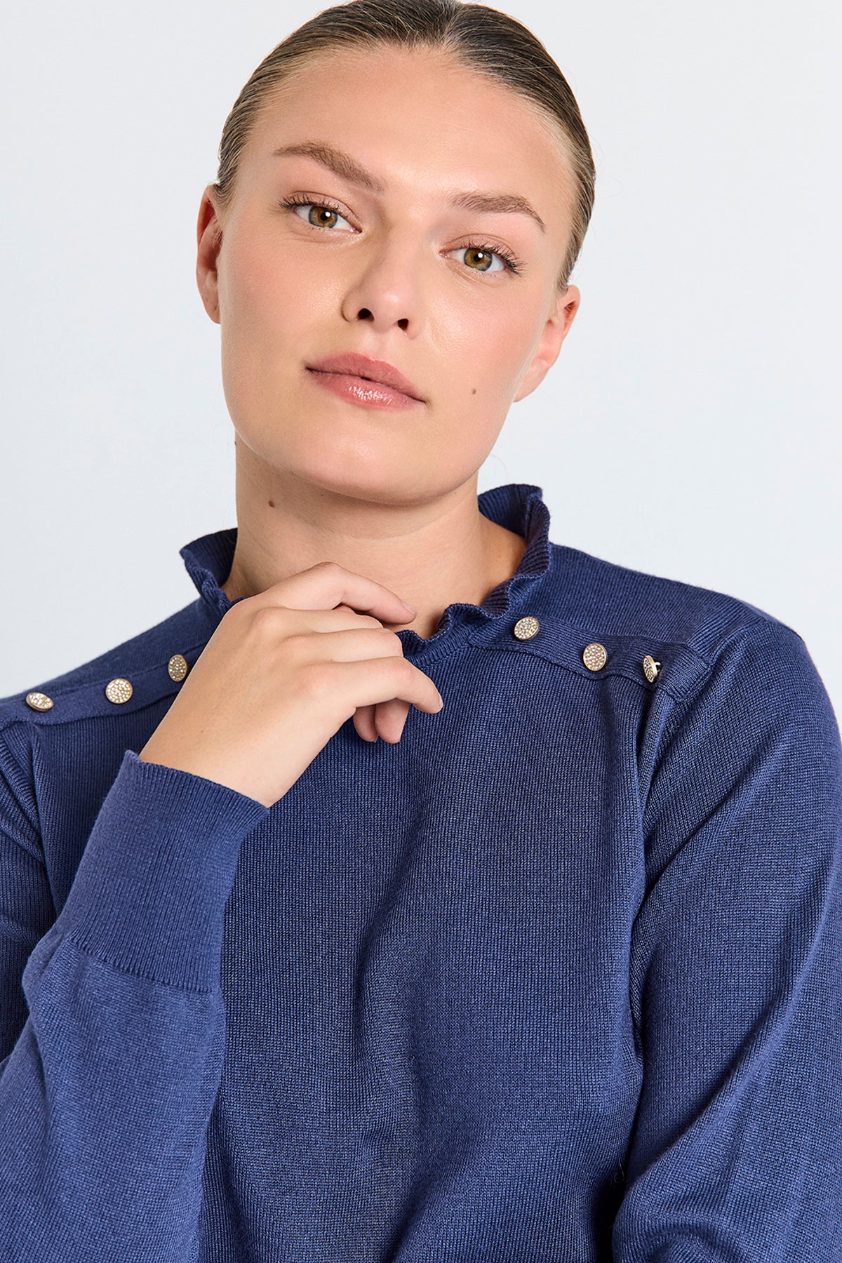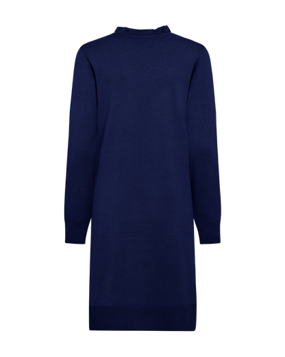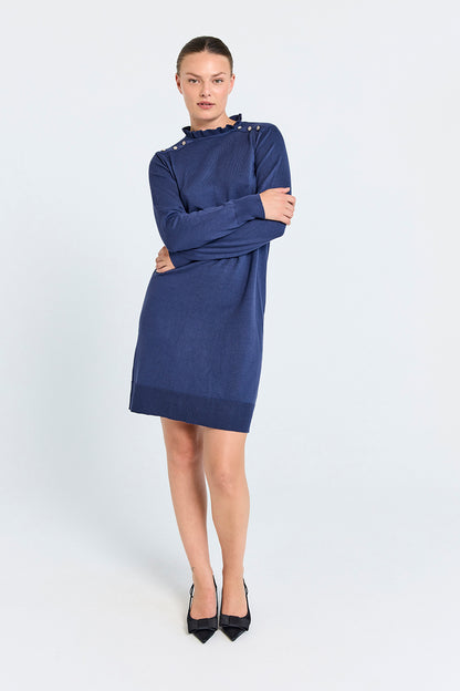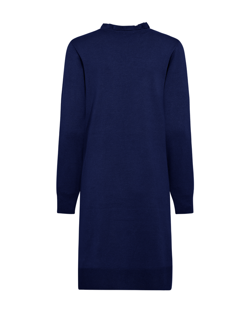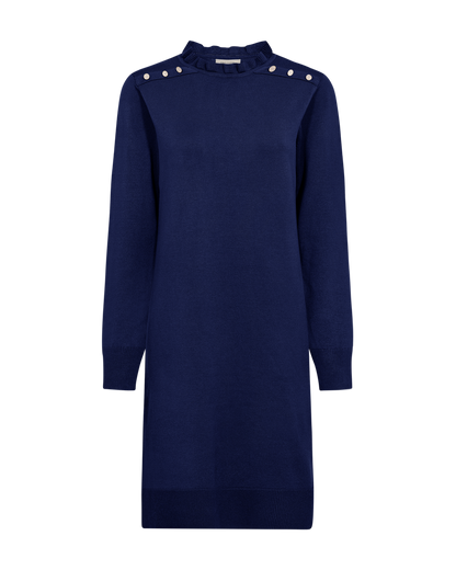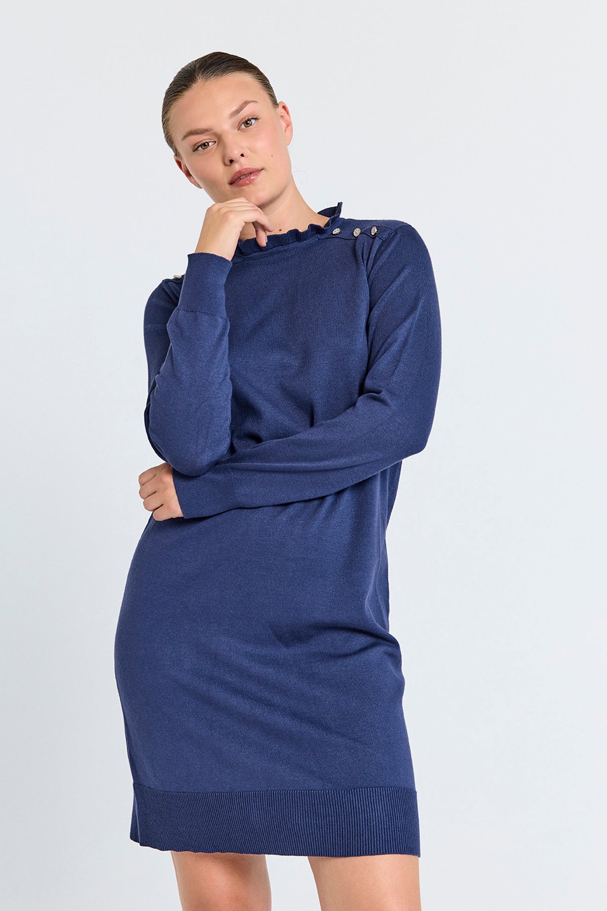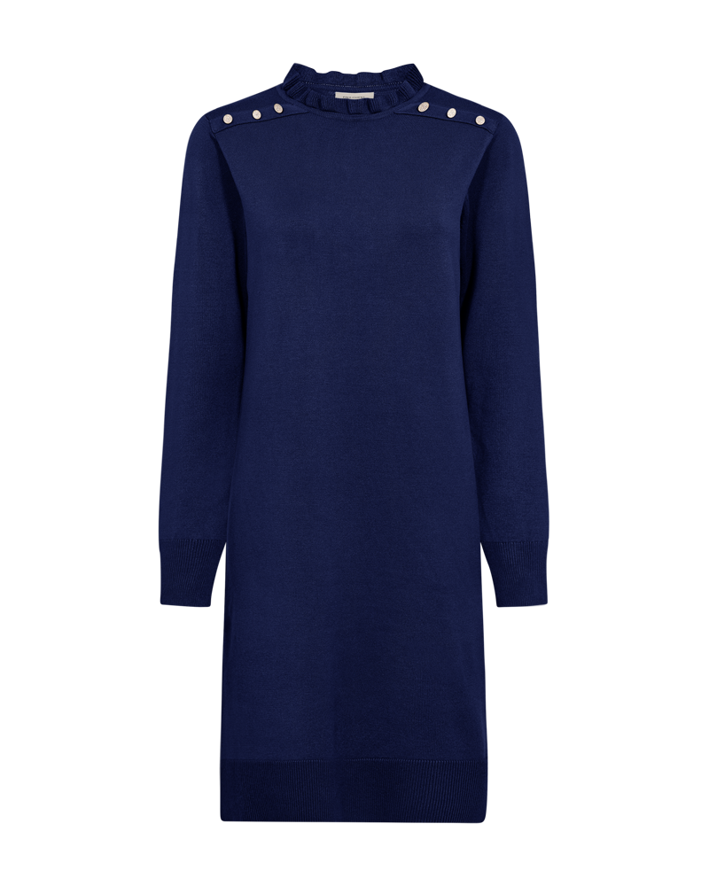 Finstrikket kjole fra Freequent i en lækker, blå farve. Kjolen har en lille krave og de fineste gyldne knapper ved skulderen. Pasformen er tætsiddende så du kan med fordel style med et bælte i taljen, hvis du gerne vil gøre dit look endnu mere taljeret. Sæt høje støvler eller en stilet til.