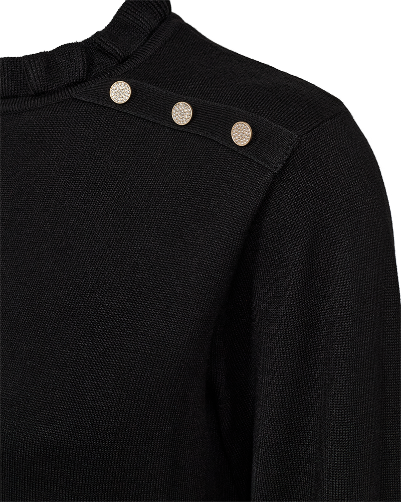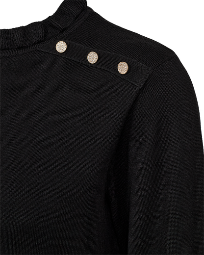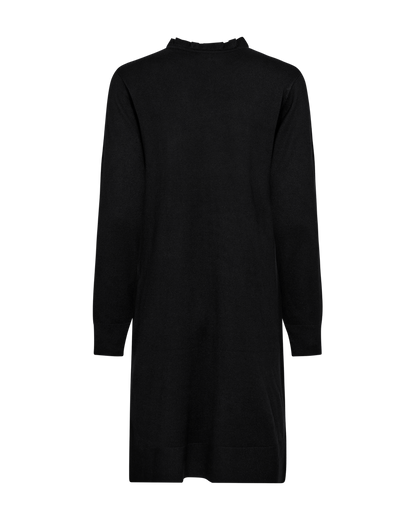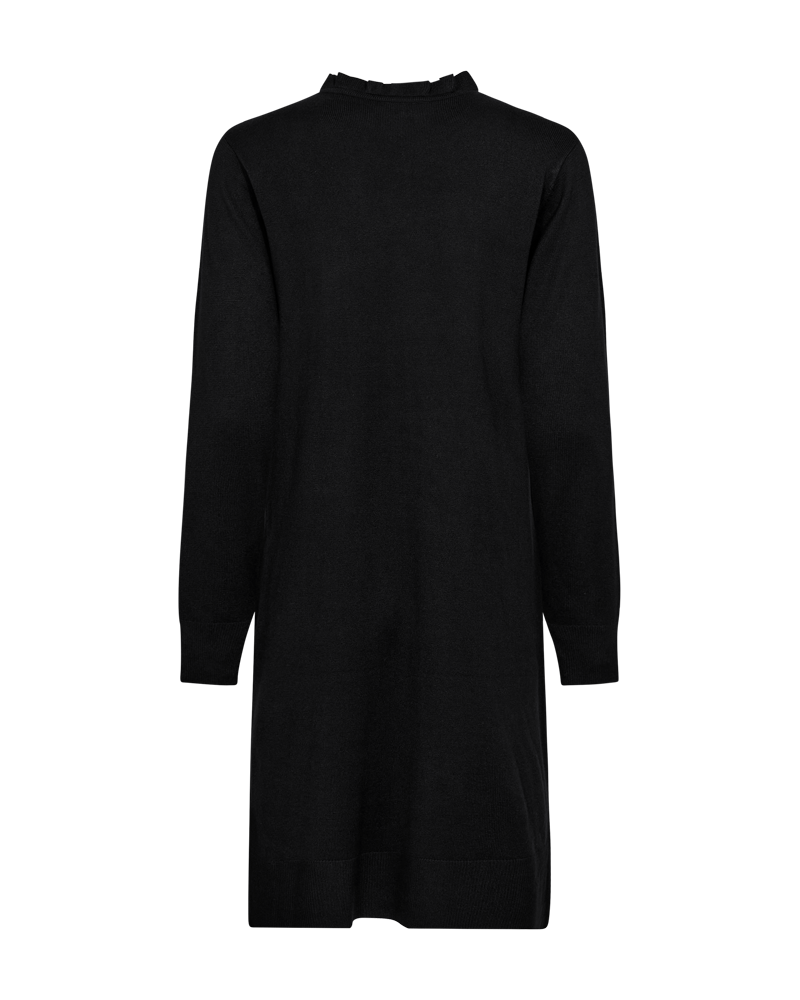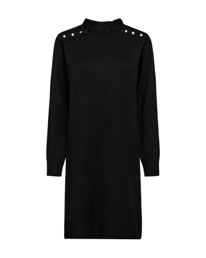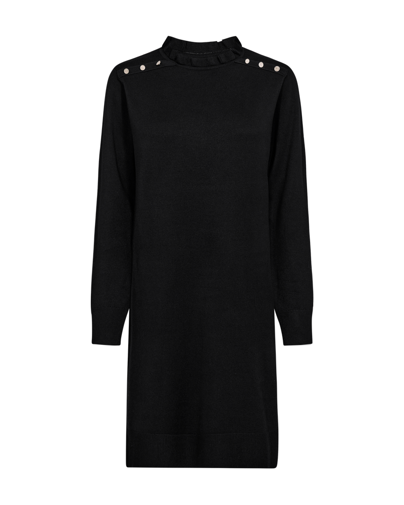 Finstrikket kjole fra Freequent i sort viskose. De gyldne knapper ved skulderen bryder det sorte, så der lige sker lit mere. Kjolen har lille, stående krave og lange ærmer. Style med et bælte over, hvis du gerne vil sætte ekstra fokus på taljen.