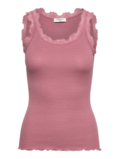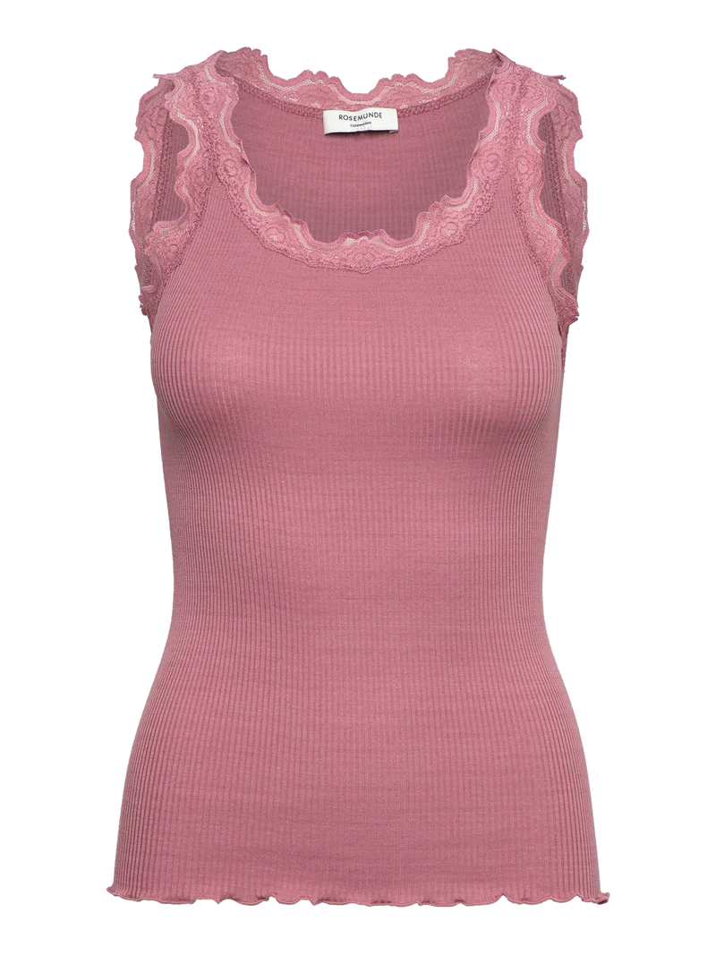 Skøn Rosemunde top i en flot gammelrosa farve. Toppen har de fine blonder langs udskæringer ved ærmer og hals. Den bløde rib kvalitet er lækker at have på. Kombinationen af silke og bomuld gør toppen åndbar. Style til brune bukser og fremhæv de varme toner i dit outfit.