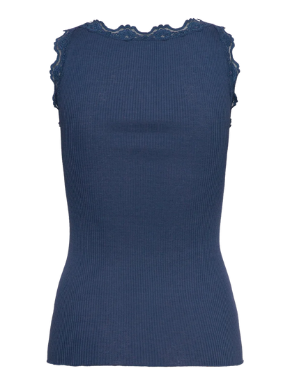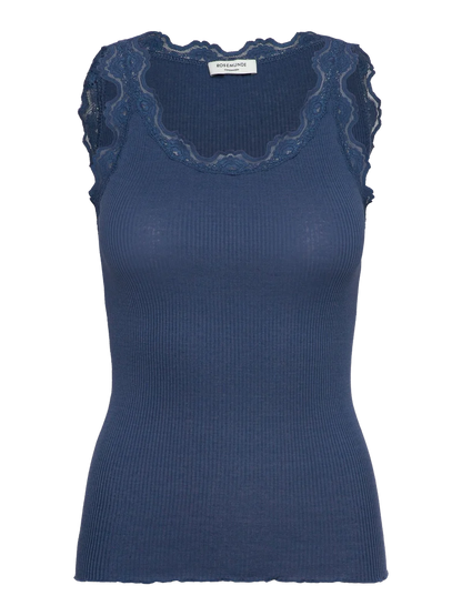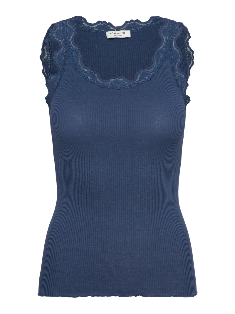 Lækker Rosemunde top i en flot, blå farve. Den bløde rib top er lavet i den lækreste blanding af silke og bomuld. Blonderne sikrer det feminine touch. Perfekt under en blazer eller strik.