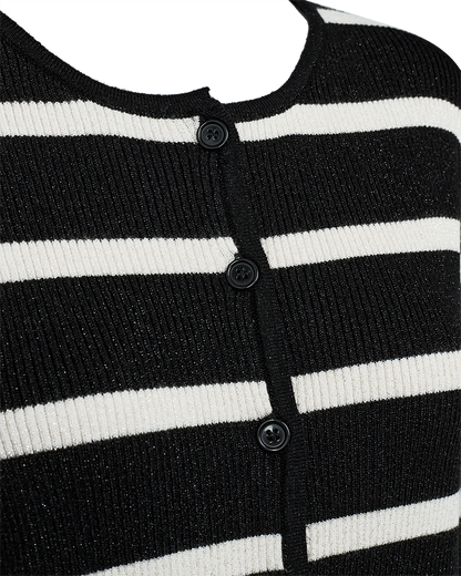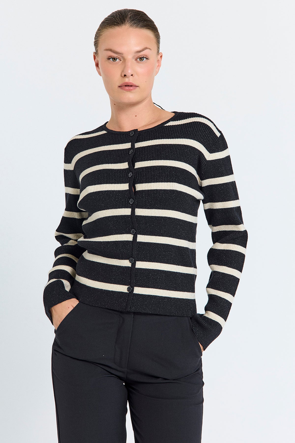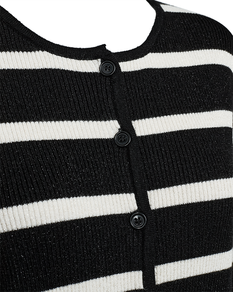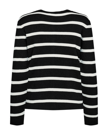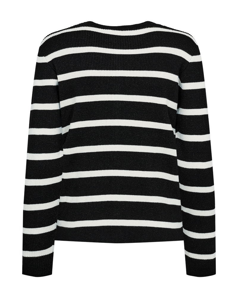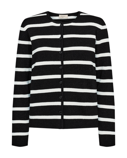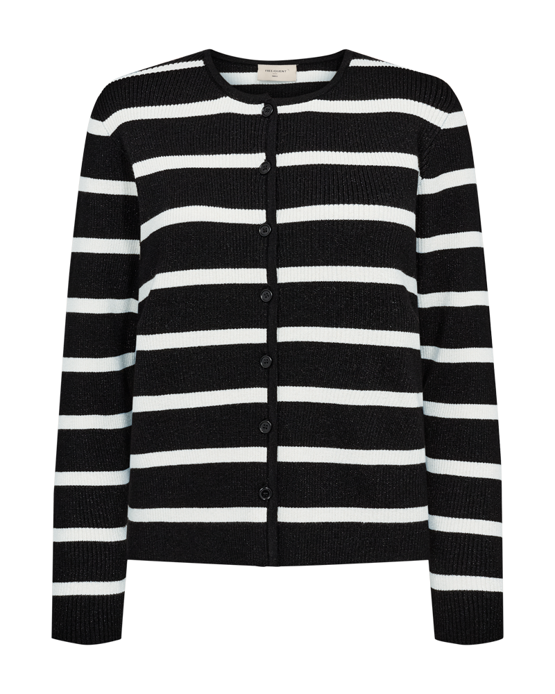 Sød cardigan fra Freequent i sort med hvide striber. Cardiganen har en tætsiddende facon og er flot at style til dine sorte bukser eller mørke jeans. Du finder også den stribede strik som en bluse uden knapper, hvis du ikke lige er på udkig efter en cardigan.