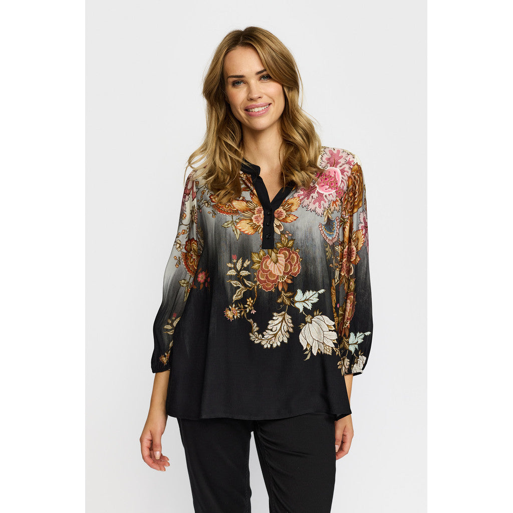 Flot bluse fra 2-Biz i et lækkert print. Blusen har knapper ned til brystet og ærmer i 3/4 længde. Super fin til et par sorte bukser med en høj stilet, hvis du skal være lidt fin.
