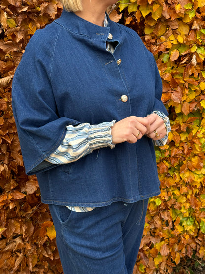 Flot denim kappe fra Marta du Château med gyldne knapper. Kappen er super fin at style over en skjorte eller strik som du ser på billedet.Bemærk: Der er meget overskudsfarve i kappen, så du skal sørge for at vaske den separat inden brug.
