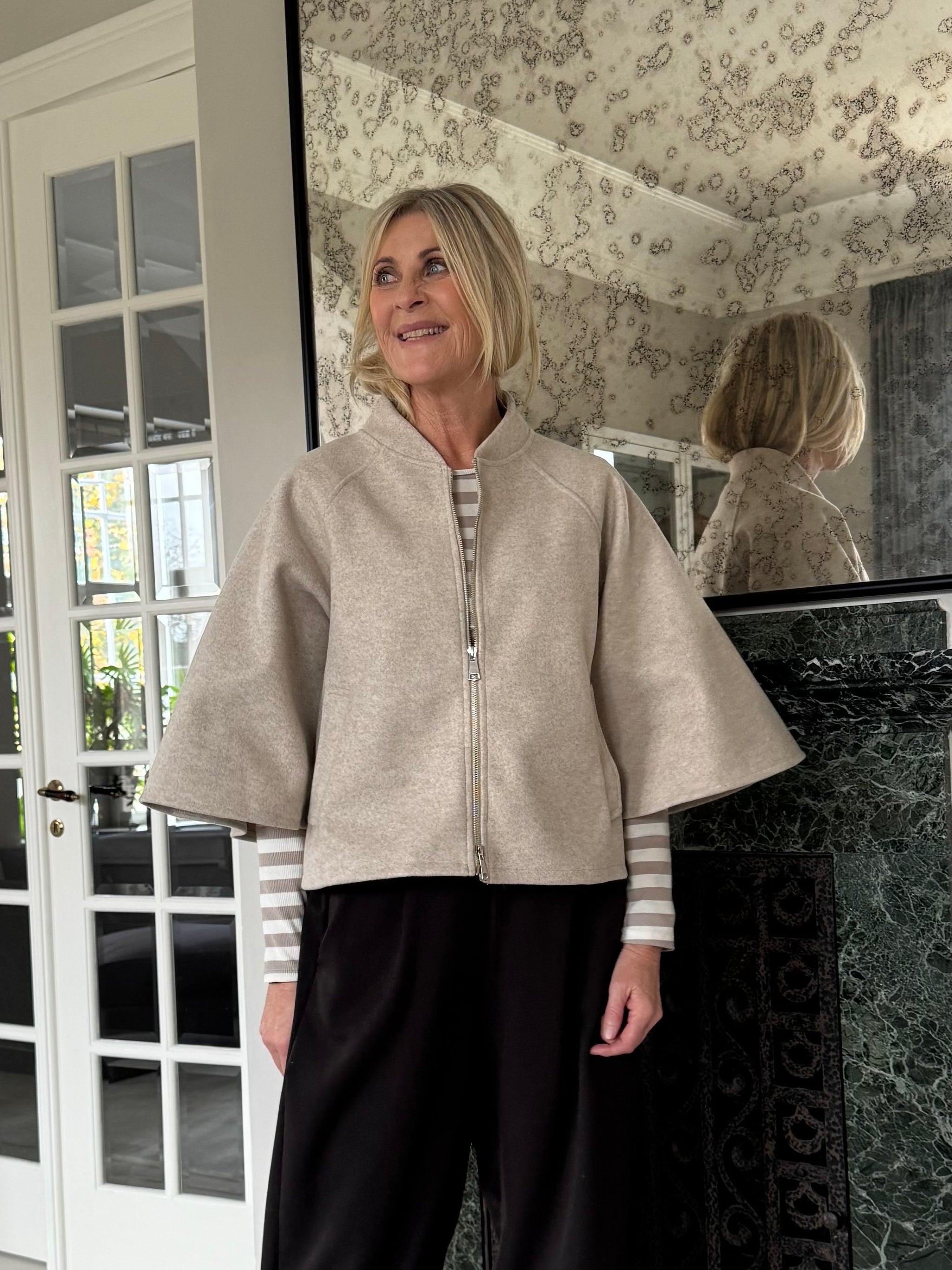 Lækker, lys kappe fra Marta du Château med smukke flagermusærmer og lynlås ned langs midten. Style over langærmede t-shirts eller skjorter indenfor. Kappen kan godt bruges som overgangsjakke på dage, hvor det ikke er koldt.
