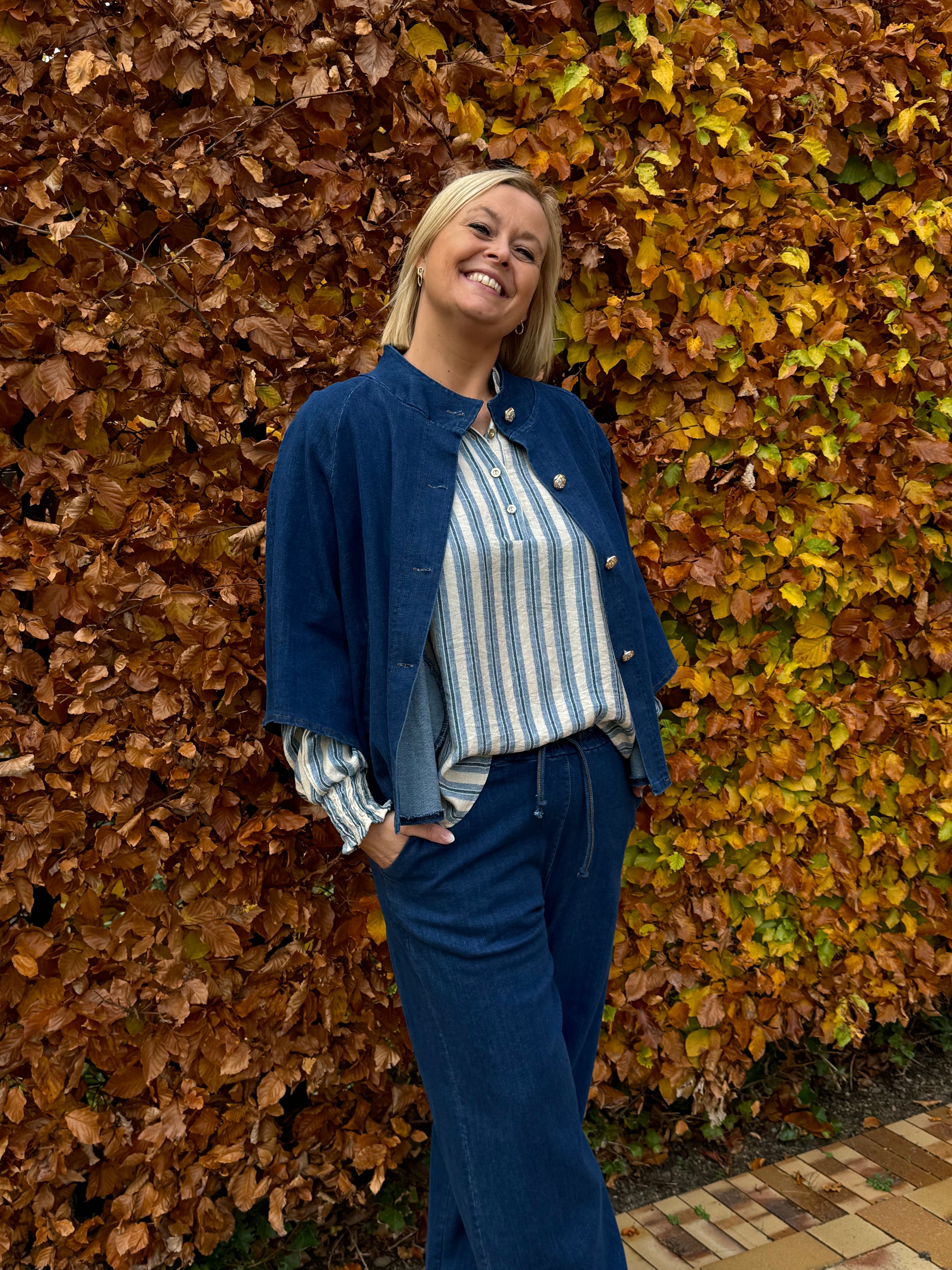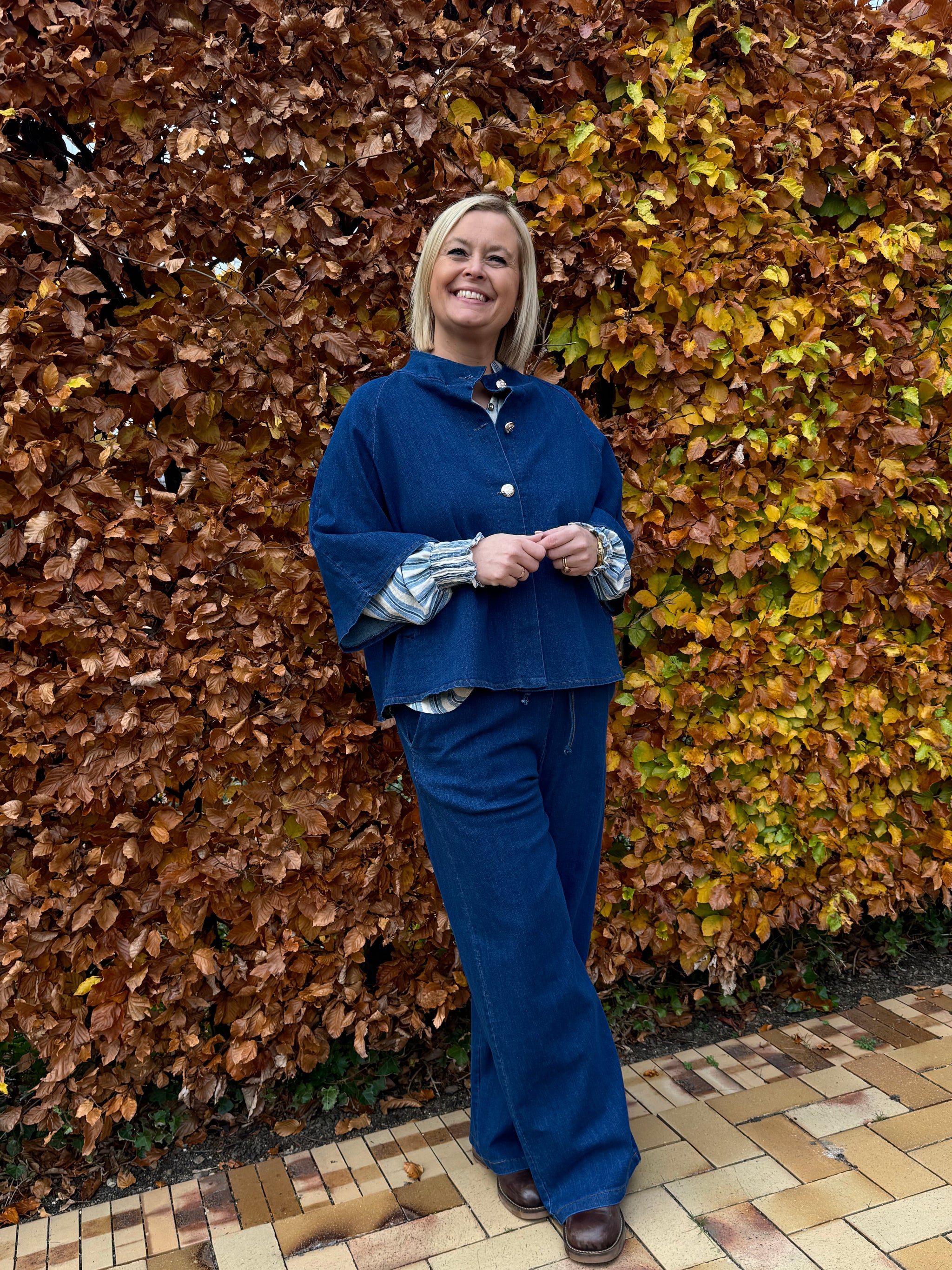 Fede denim bukser fra Marta du Château med brede ben og elastik i linningen. Du kan style med den matchende kappe i samme denim farve, hvis du gerne vil have et sæt som modellen. Hun har sat den blåstribede skjorte under.Bemærk: Der er meget overskudsfarve i bukserne, så du skal sørge for at vaske dem separat inden brug.