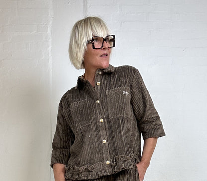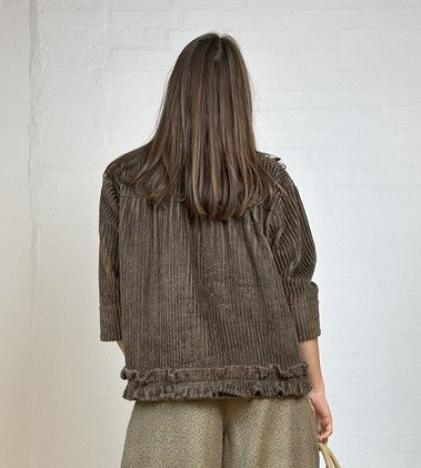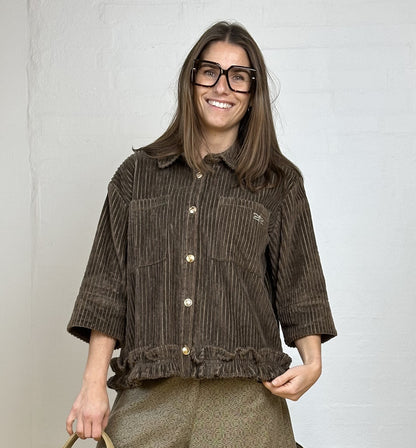 Lækker fløjlsskjorte fra Gaspar i gråbrun fløjl med gyldne knapper. Flæsekanten i bunden sikrer et feminint touch.