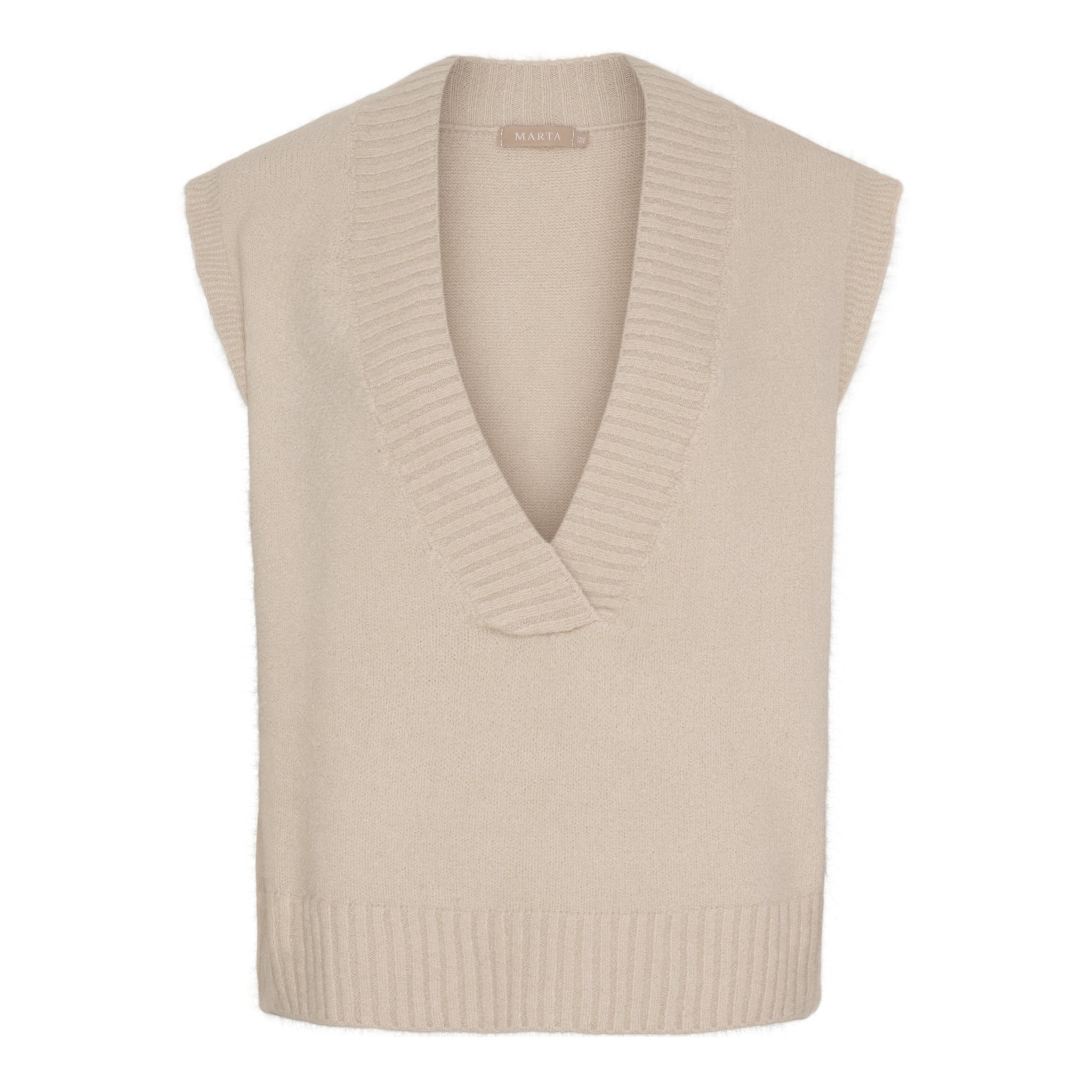 Beige strikvest med dyb v-udskæring. Udskæringen er kantet med en bred ribkant, så du får et virkelig lækkert look. Style over dine skjorter eller fine mesh bluser.