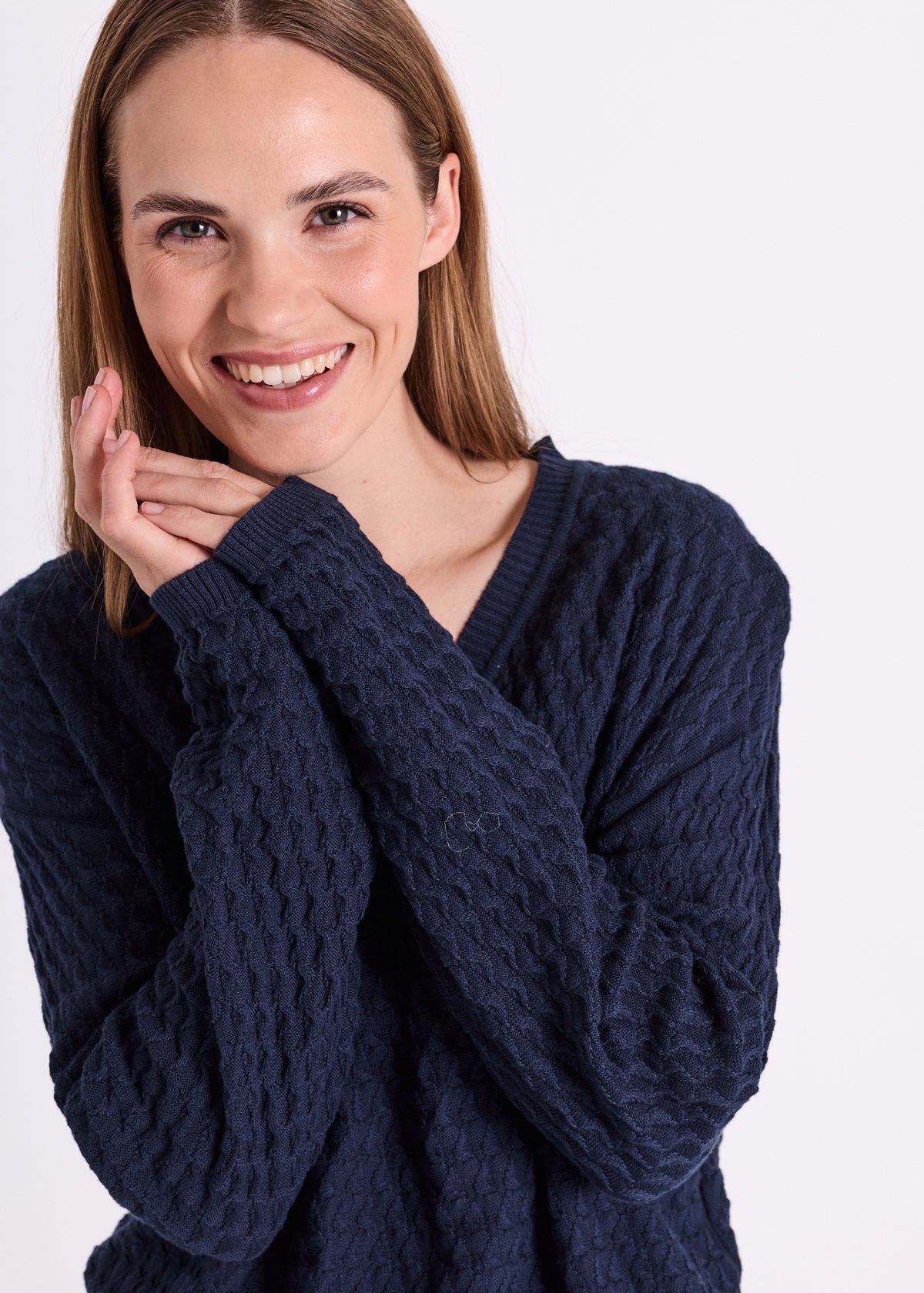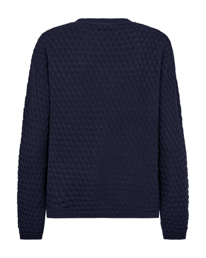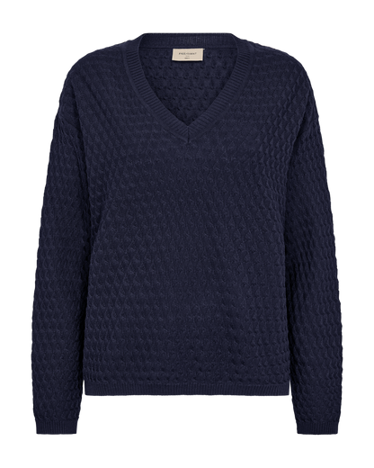 Skøn mørkeblå strikbluse fra Freequent med fin struktur i materialet. Style til dine blå jeans eller et par grå bukser, hvis du gerne vil fremhæve den mørkeblå farve.