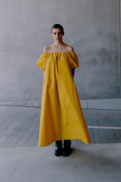 Off-shoulder kjole fra 2NDDAY, i en smuk gul farve. Kjolen har har korte ballonærmer, som giver et feminint udtryk.