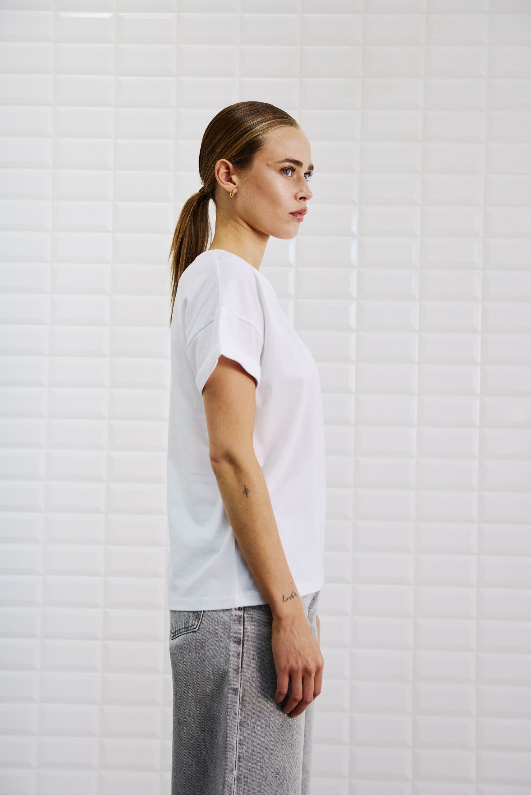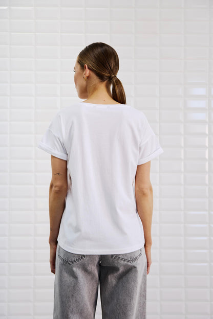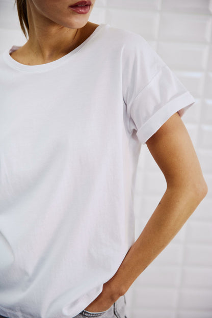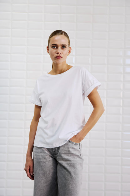 Hvid T-shirt med detalje af opsmøg ved ærmer, fra WithBlack perfekt basis T-shirt til garderoben.