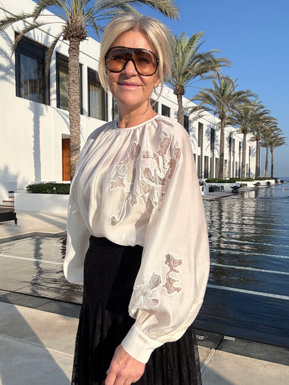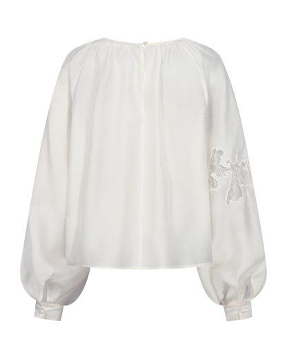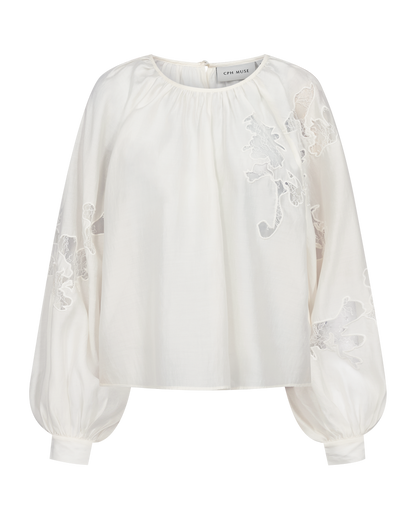 Hvid bluse fra Copenhagen Muse med fine ballonærmer, der giver et feminint og eksklusivt udtryk. Blusen er designet med elegante blonde-patches, som er smukt syet ind i blusen og tilfører et klassisk og sofistikeret look. En tidløs bluse, der nemt kan styles både til hverdag og mere formelle anledninger.
