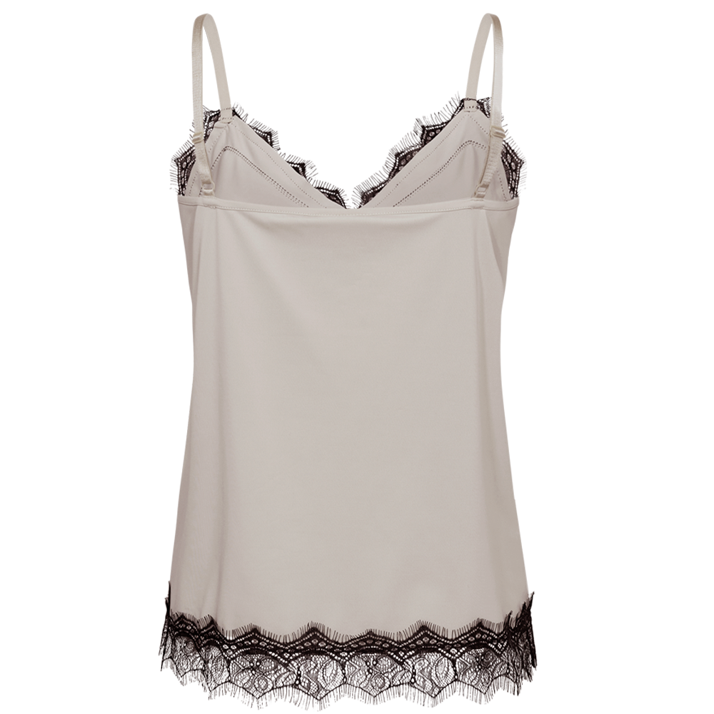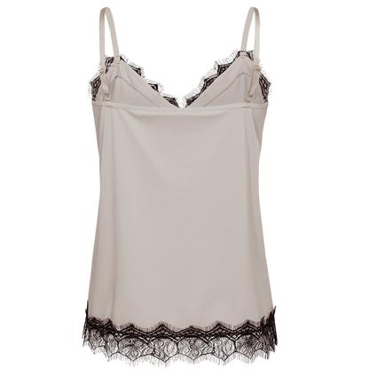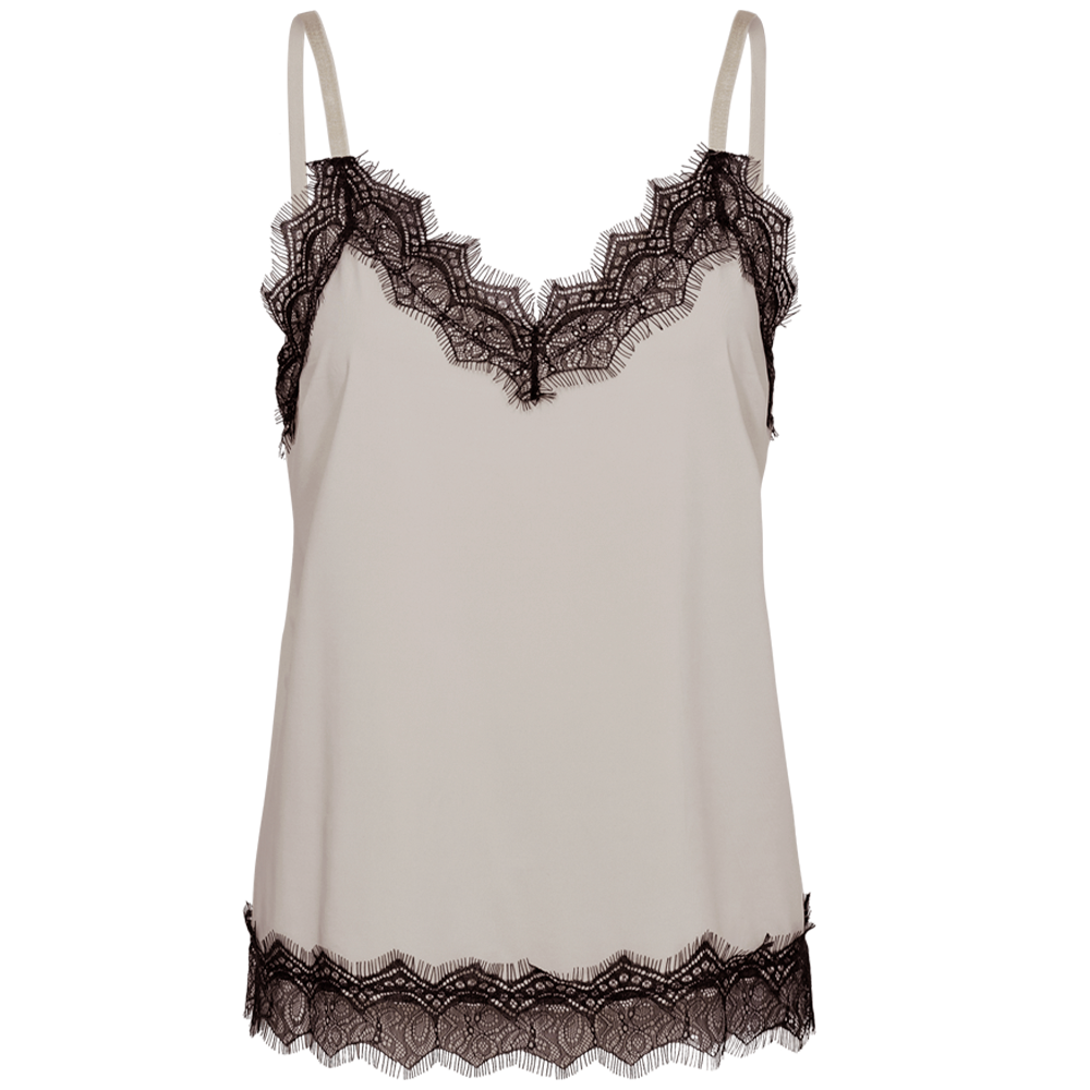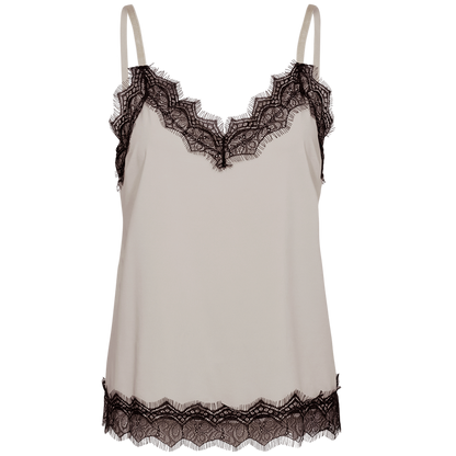 Den populære Bicco top fra Freequent er kommet i en lækker to-farvet variant. Selve toppen er sandfarvet og blonderne er sorte. Den fine kontrast på farverne passer godt ind i mode trenden lige nu. Style med en sort blazer over.
