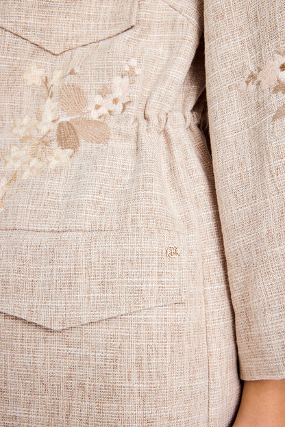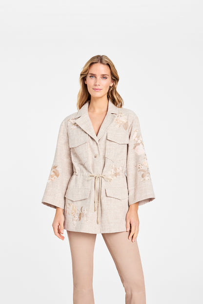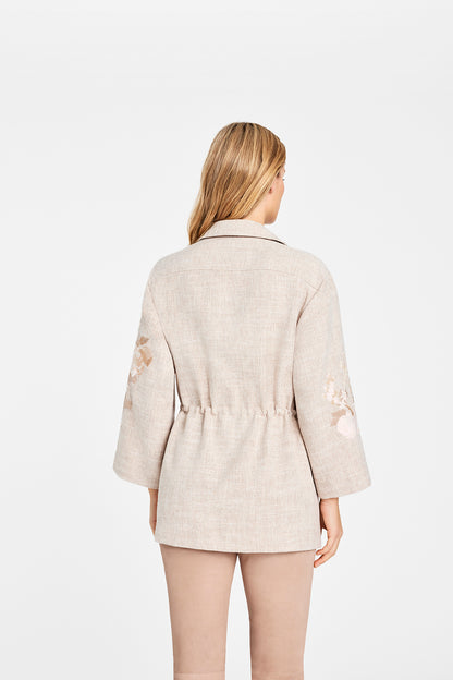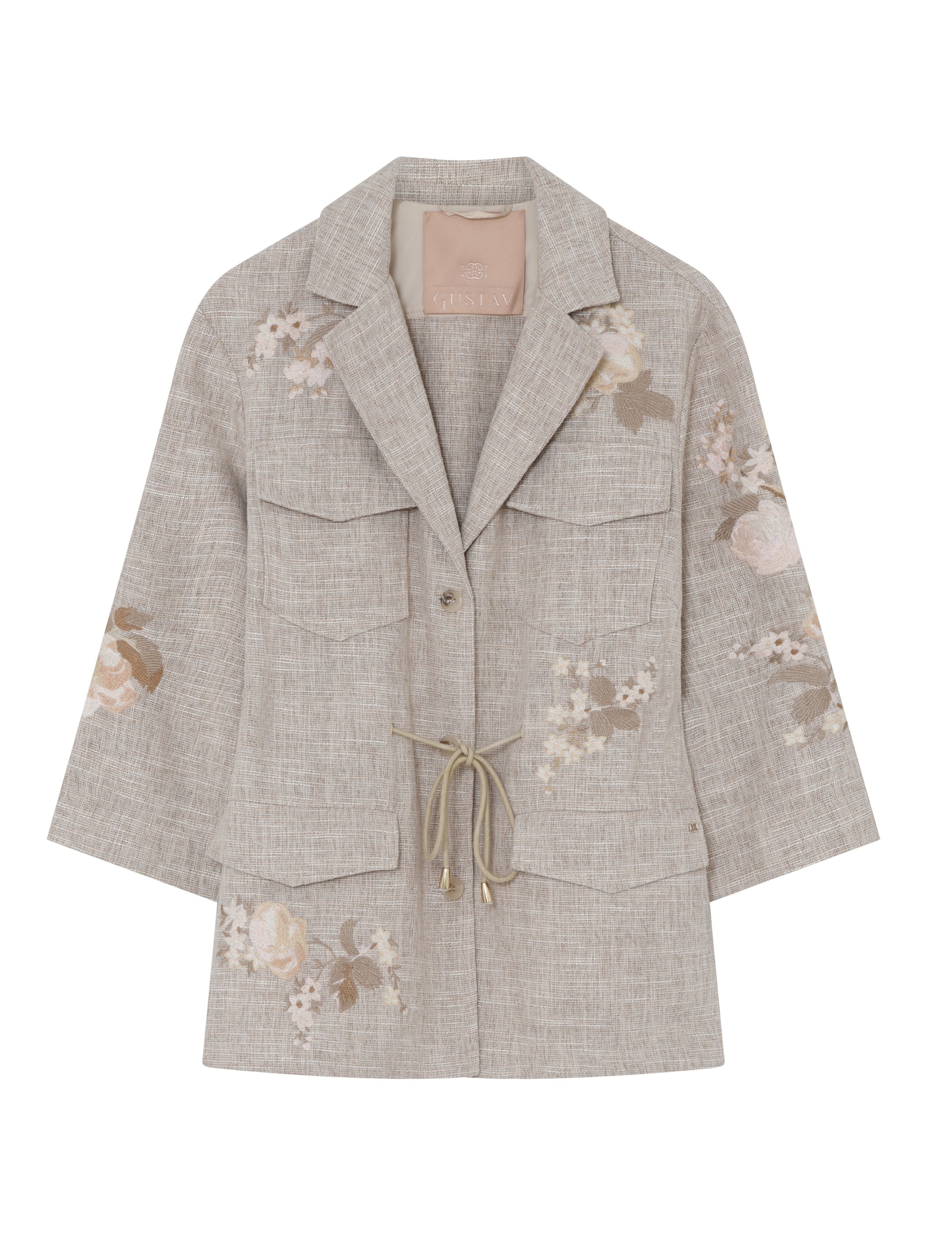 Feminin jakke fra Gustav  med søde blomster broderier. Jakken lukkes med knapper og har et smalt bånd, der kan bindes i livet, hvis du ønsker et mere taljeret look.
