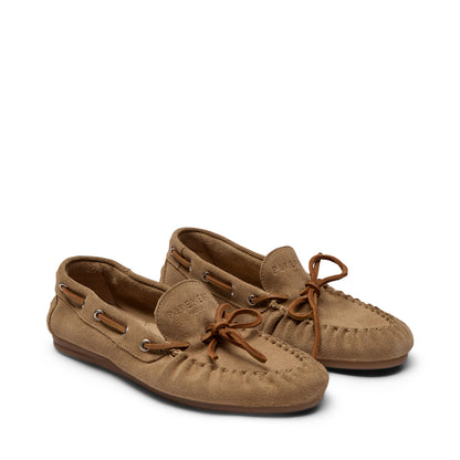 Lækre ruskinds loafers fra Pavement i en lys camel farve. De fine loafers har brune snørebånd, der også følger det øverste af skoen og giver den det trendy mokkasin look. Style de fine ruskinds mokkasiner til dine jeans eller lyse bukser. Perfekt til det spirende forår og ind i sommeren.