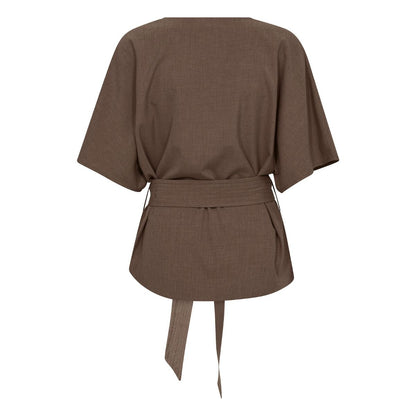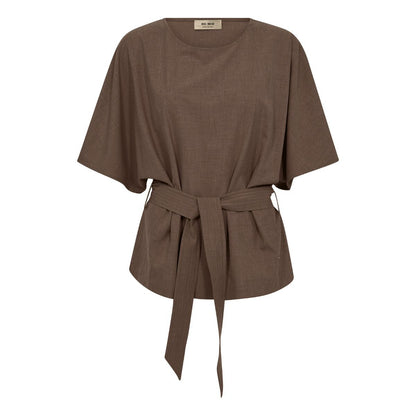 Lækker bluse fra MOS MOSH i en smuk brun farve. Blusen har bredt bindebånd i livet, så du kan få et flot, taljeret look. Ærmerne er til den brede side og giver en fin flagermuseffekt, når du binder bæltet i taljen.