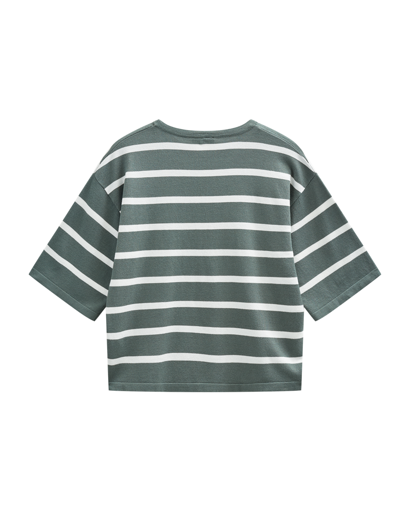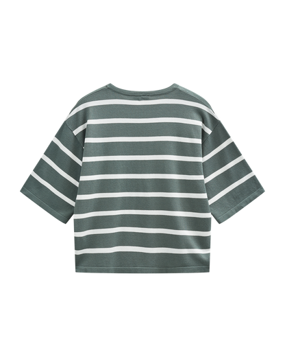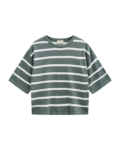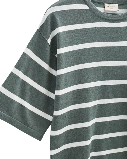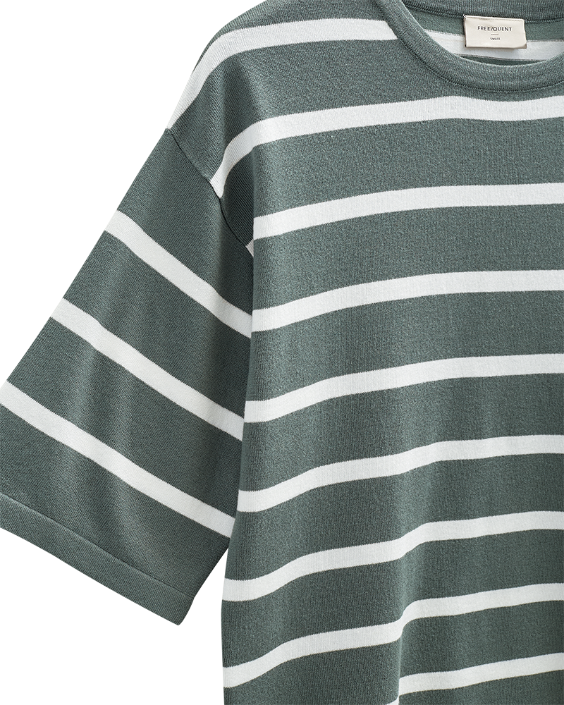 Skøn bluse fra Freequent i en smuk grøn farve. Den grønne bluse har fine, hvide striber og korte ærmer, der slutter ved albuen. Super flot til dine lyse bukser, så du kan blive forårsklar.