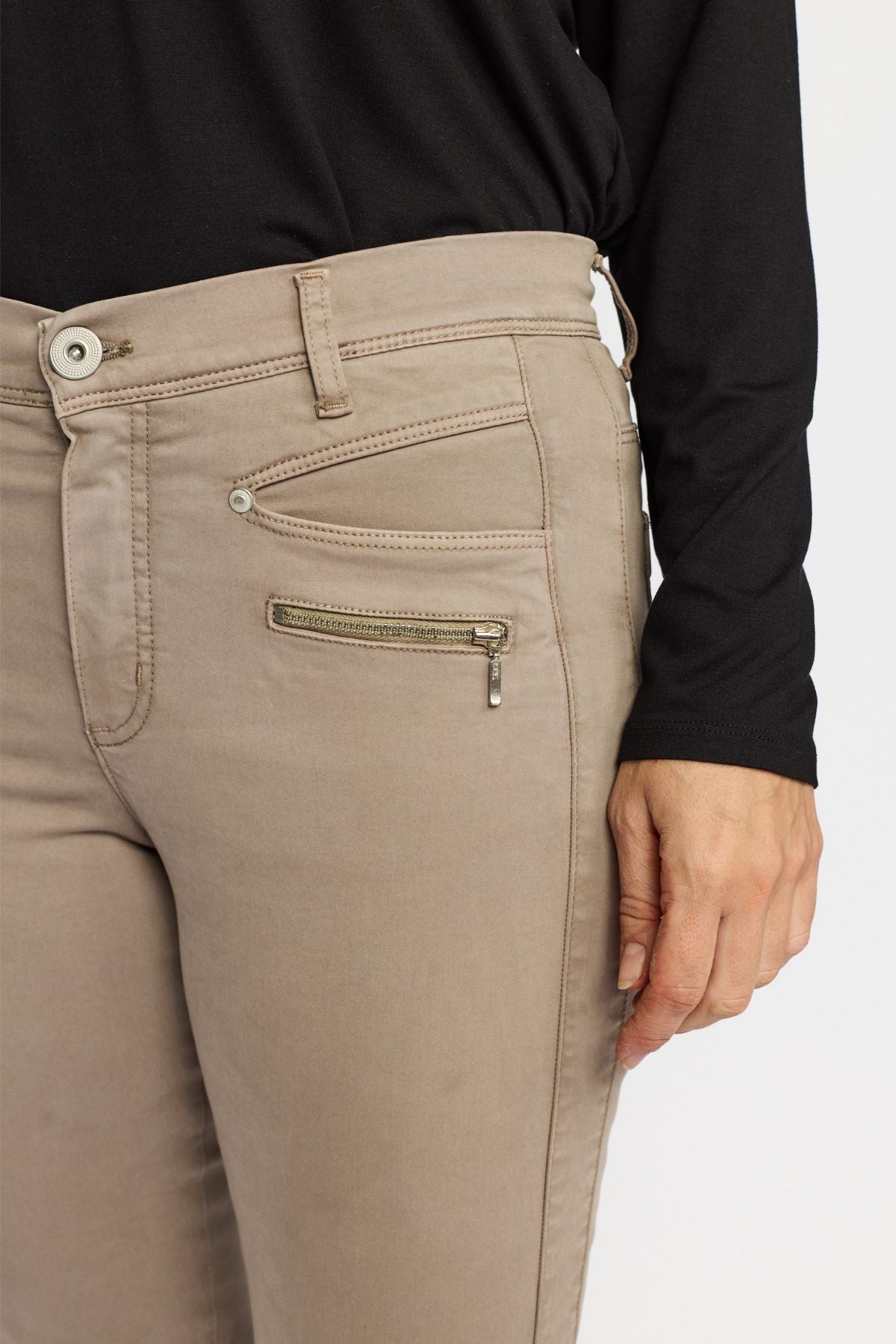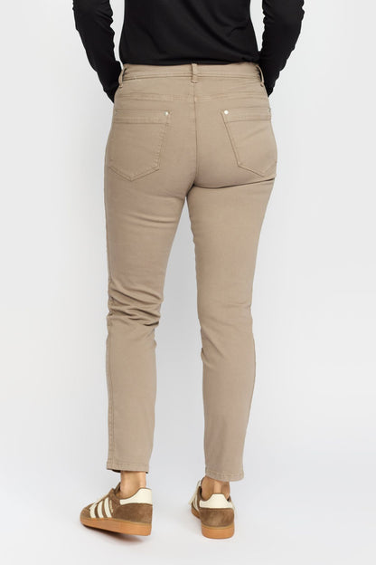 De gode Rany bukser fra 2-Biz i en lækker, lysebrun farve. Buksen sidder pænt til og går ind ved anklerne. Den gode stræk sikrer, at buksen er behagelig at have på. Der er almindelige lommer men også små lommer med lynlås.