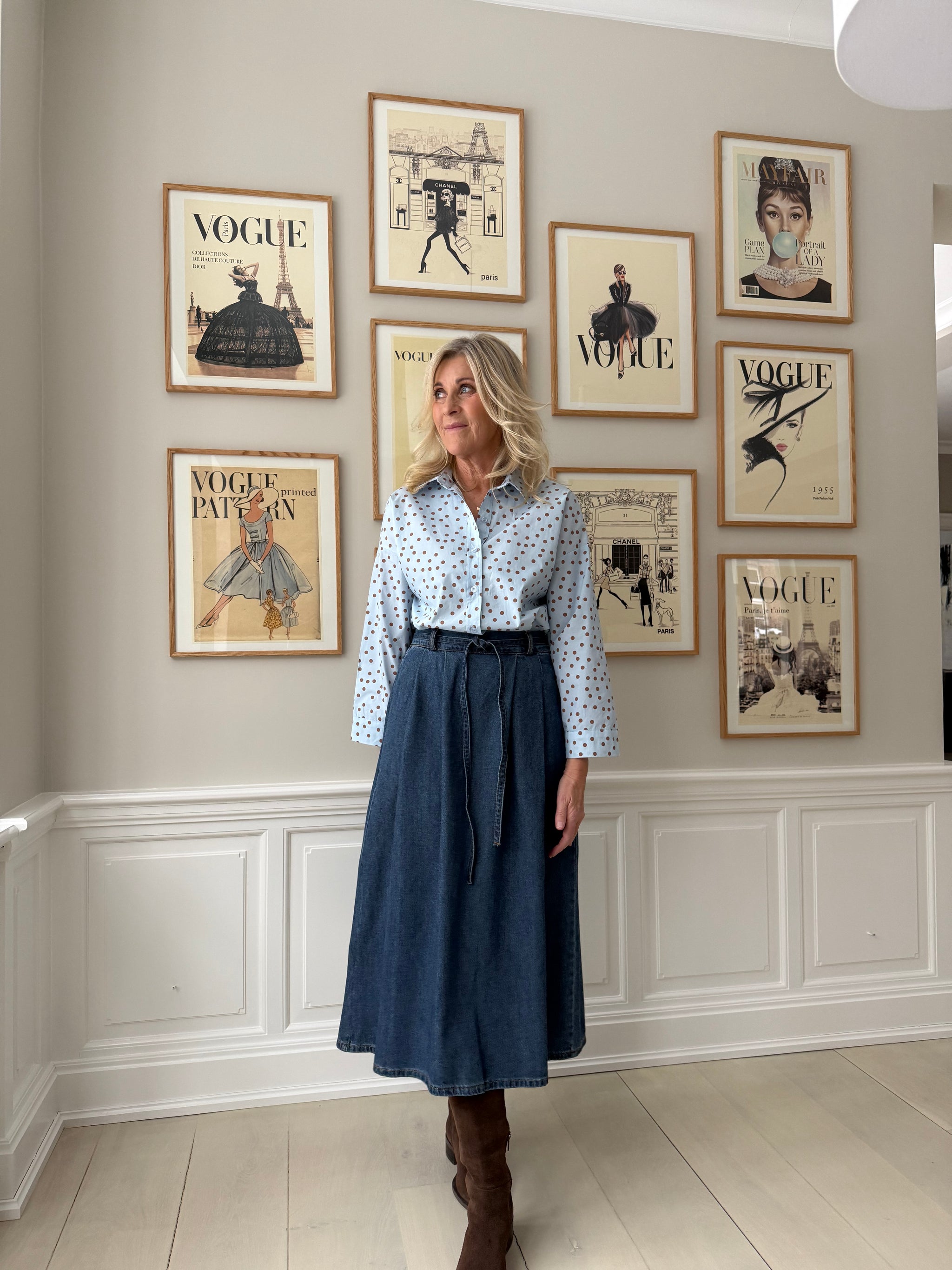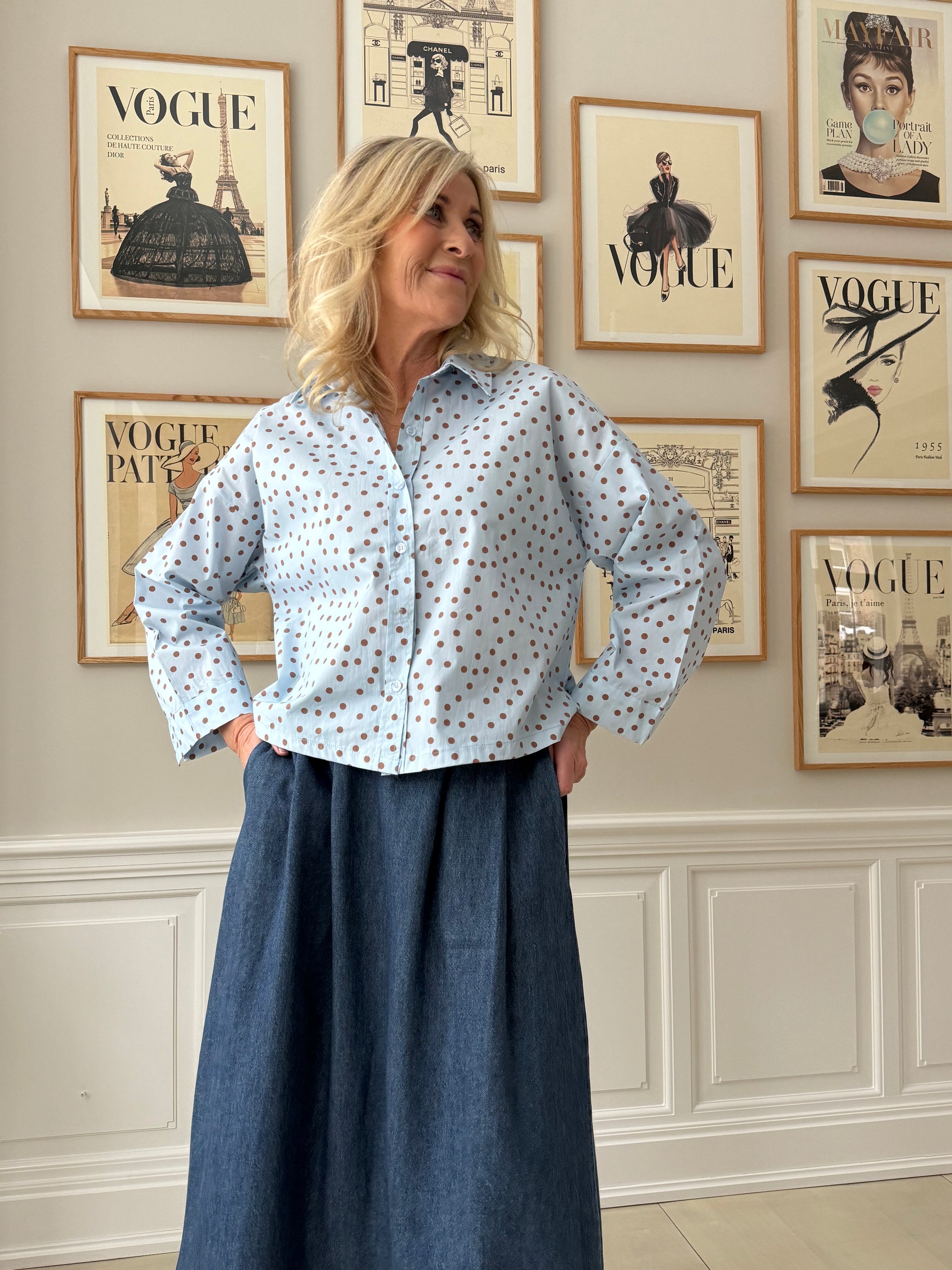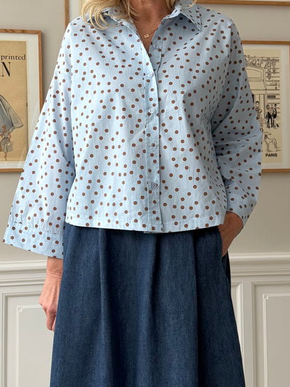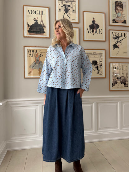 Prikket skjorte fra Amaze Cph i en fantastisk lyseblå farve. Prikkerne er brune og giver et flot farvespil til den lyseblå skjorte. Skjorten har et firkantet snit, som er cropped. Det gør den flot til en nederdel, som du ser på modelbillederne. Har du en højtaljet nederdel kan skjorten fint puttes ned i nederdelen, hvis ikke du er til det løse snit.
