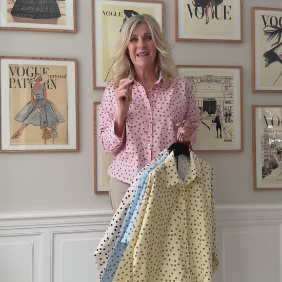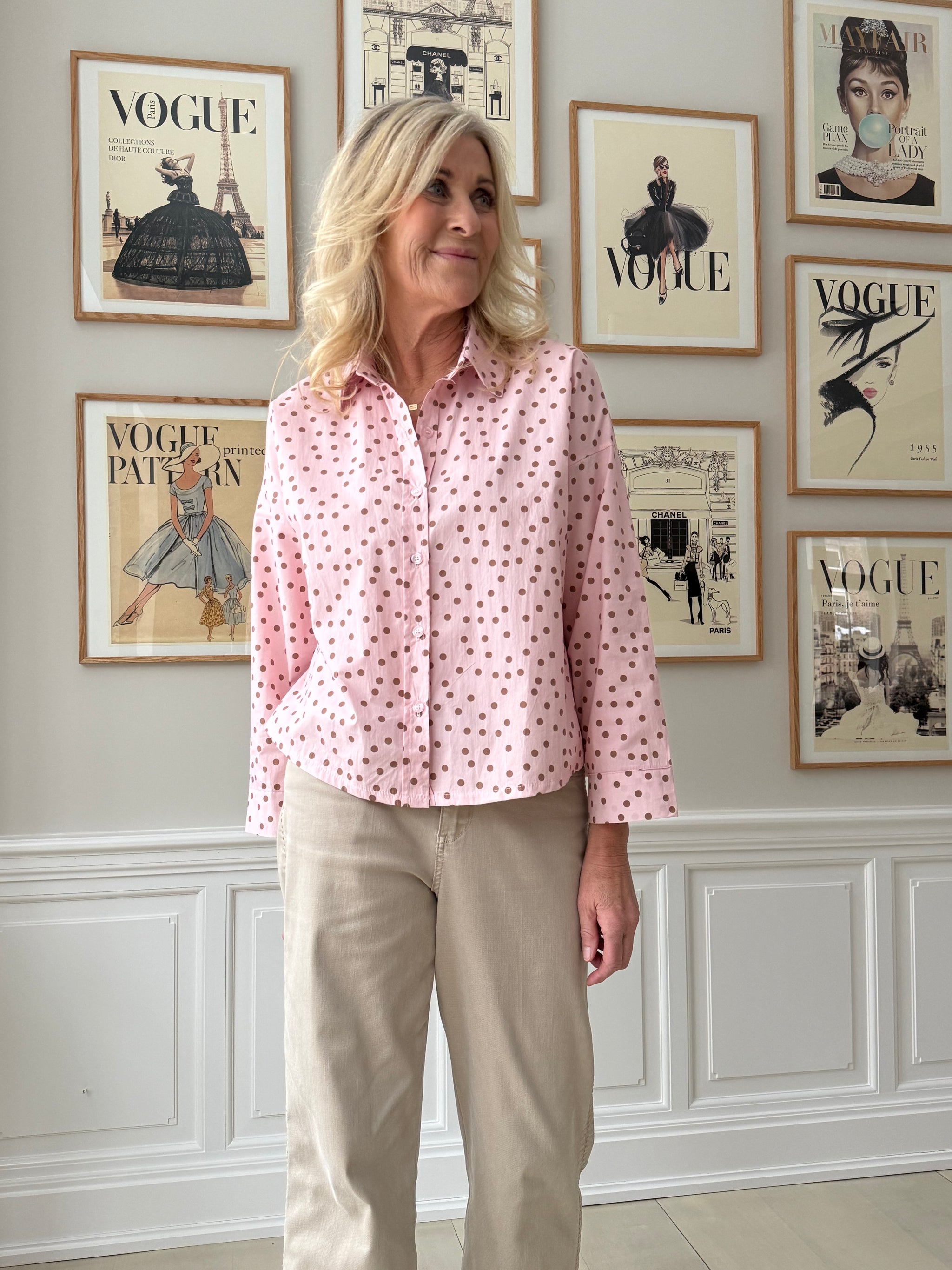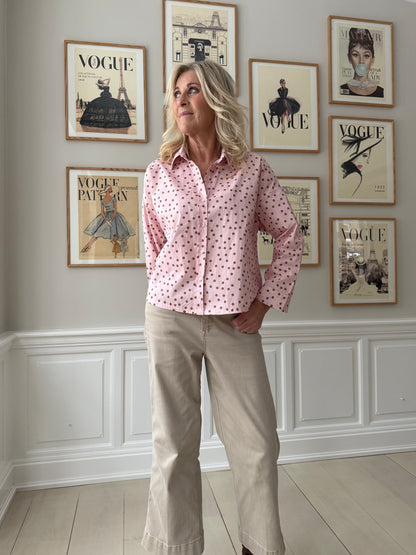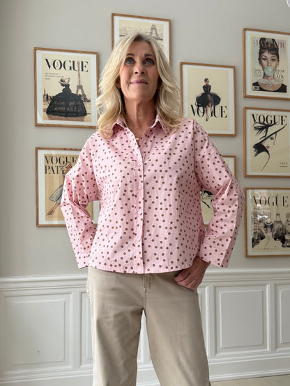 Skøn prikket, skjorte fra Amaze Cph i en smuk lyserød nuance. Skjortens lysebrune prikker giver et feminint look og gør skjorten super velegnet til foråret. Det firkantede snit er cropped, så skjorten er til den korte side. Det er derfor oplagt at style med højtaljede bukser, så du ikke har et outfit, der skiller ad på midten.