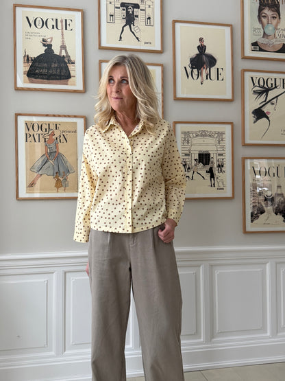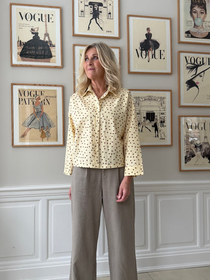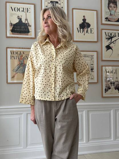 Cropped skjorte fra Amaze Cph i en sart, lysegul farve. Skjorten har de sødeste, lysebrune prikker og brede manchetter. Den gode poplin kvalitet, giver skjorten et stramt look, der understreges af de flotte manchetter. Det firkantede snit passer godt til tidens trends og er flot at sætte til bukser med høj talje.