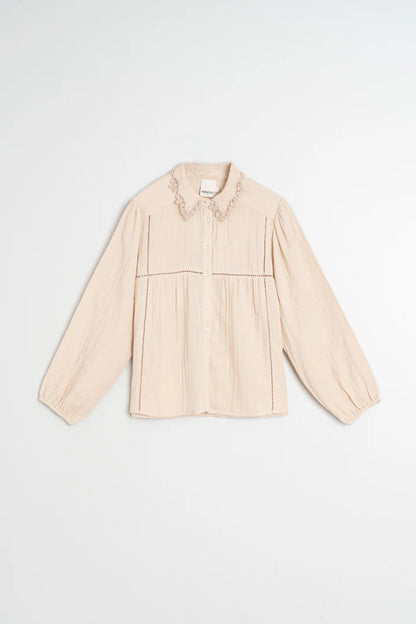 Flot bomuldsskjorte fra Indi & Cold med smukt broderi på kraven og fint hulmønster. Den varme creme farve er super flot til foråret og giver dig mulighed for at skabe et lækkert boheme outfit. Style til dine jeans eller et par lyse bukser, hvis du gerne vil have helt lyst tøj på.
