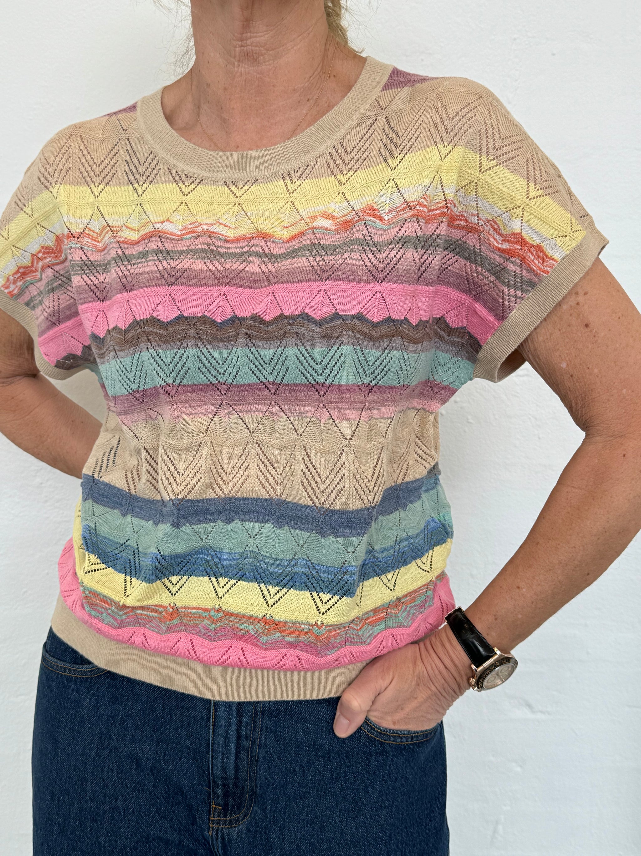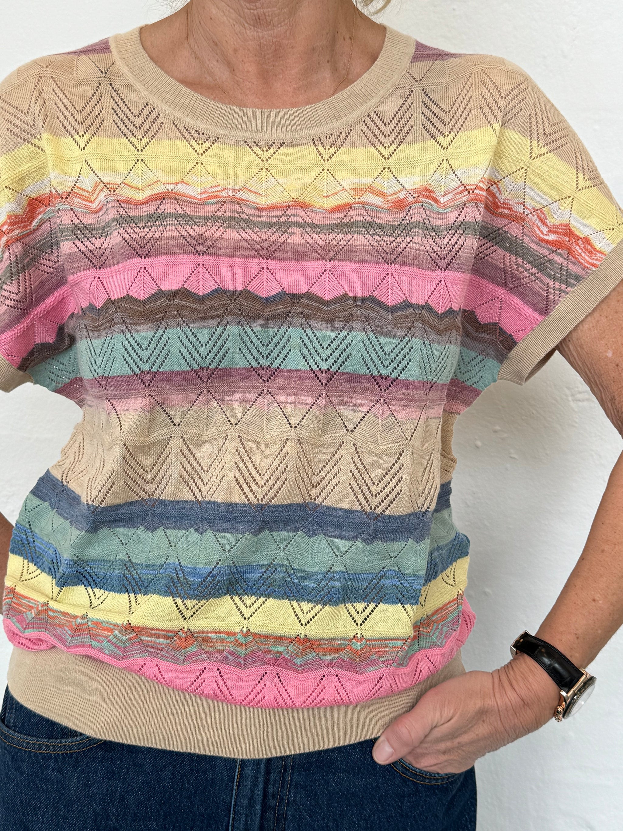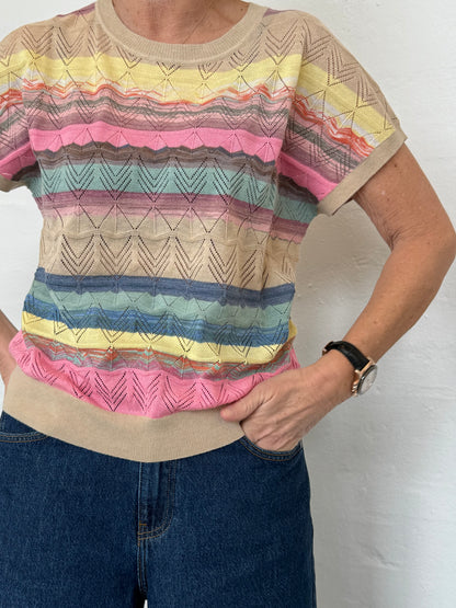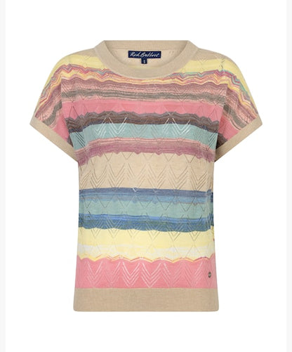 Sød og forårsagtig strikbluse fra Red Button med mange farver. Blusen er helt finstrikket og har et flot chevron hulmønster, som bryder. Ribkanterne er lavet i en flot sandfarve og giver en lækker finish på blusen. Style til dine lyse bukser eller jeans med en off white blazer over.