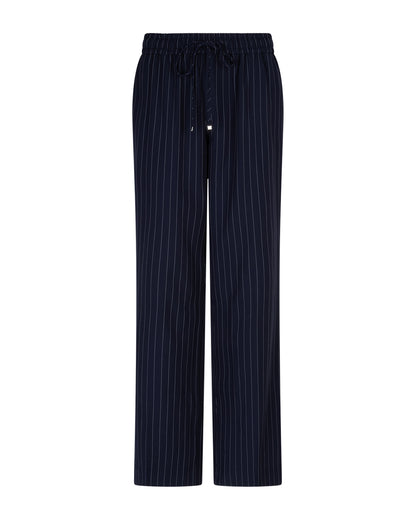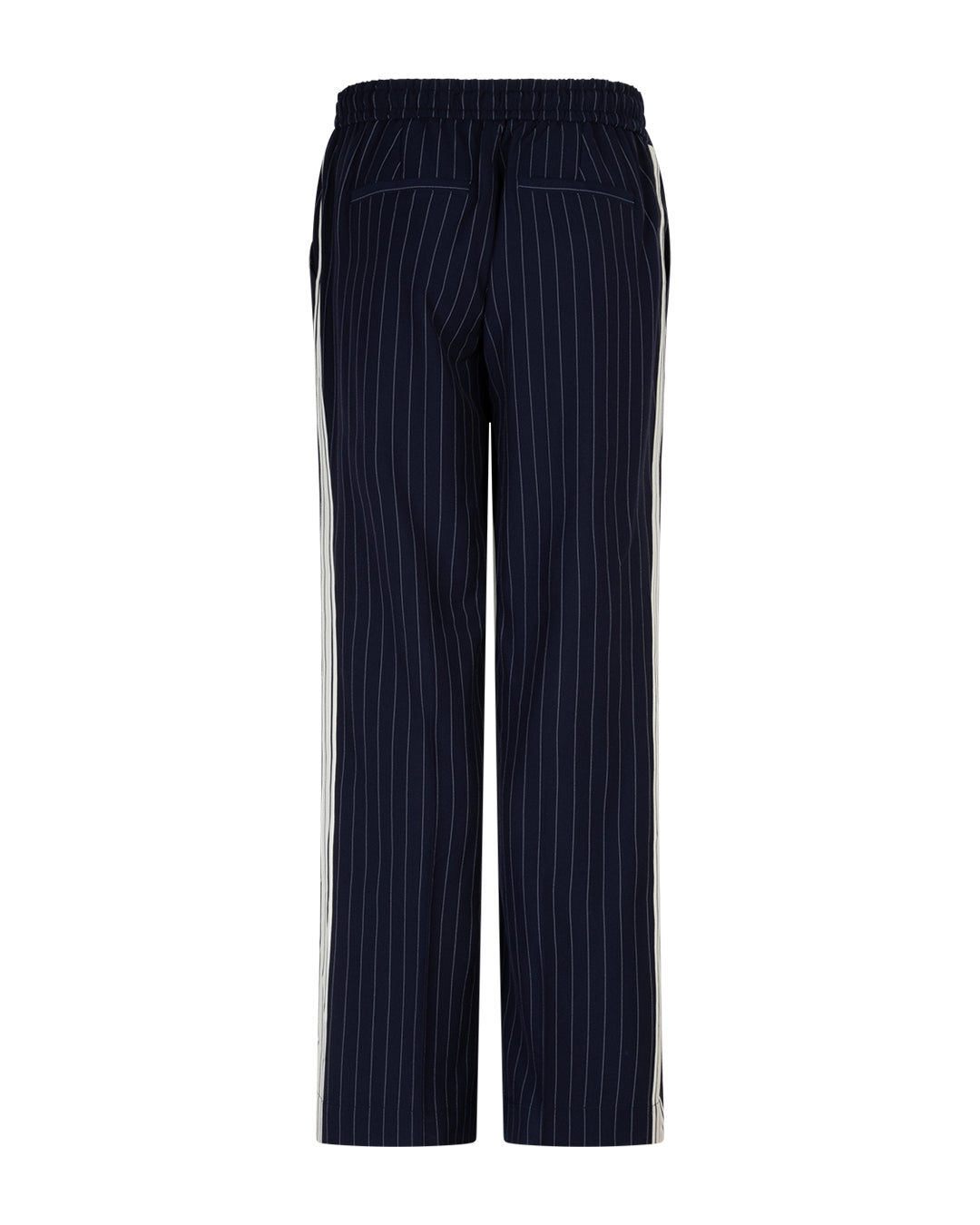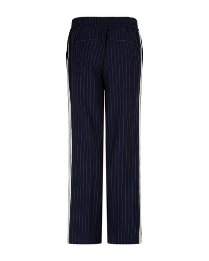 Fede nålestribede bukser fra Red Button i en flot, mørkeblå farve. Bukserne er bløde i materialet og har elastik i linningen, så de er behagelige at have på. Der er en hvid gallon ned langs siden, så du får et cool look. Style med en hvid skjorte og blazer og fuldend stilen.