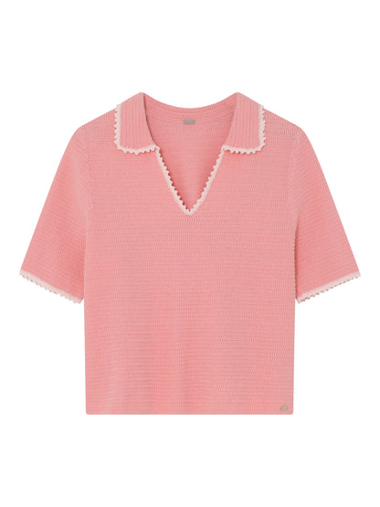 Denne søde strikbluse fra Gustav er strikket i ren bomuld og har et fint, detaljeret udtryk. Isobel er designet med en klassisk polokrave, der får et feminint modspil af de hvide kniplinger langs kanten. Den koralrøde farve og de korte ærmer gør blusen til et friskt indslag i din garderobe, mens den riflede struktur i strikken giver tøjet karakter.