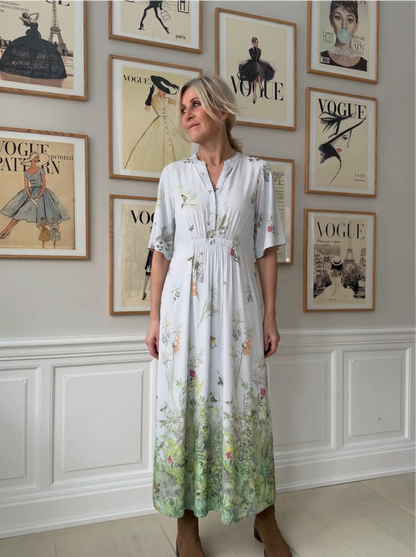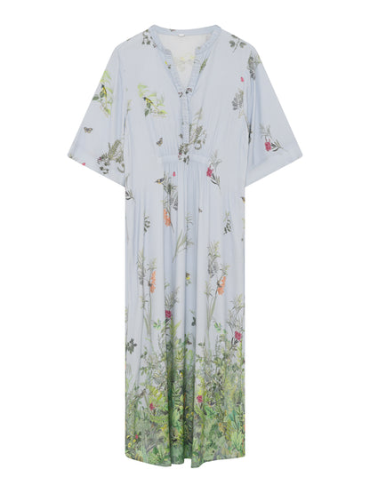 Hali kjolen fra Gustav er en let og feminin kjole i en lyseblå nuance med et fint grønt blomsterprint. Kjolen har et snit under barmen, som lader stoffet falde flot og giver en god figur. Den er designet med korte ærmer og en fin v-udskæring. Materialet består af en blød viskoseblanding med stræk, der sikrer god bevægelighed.