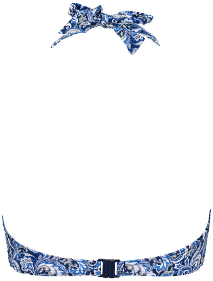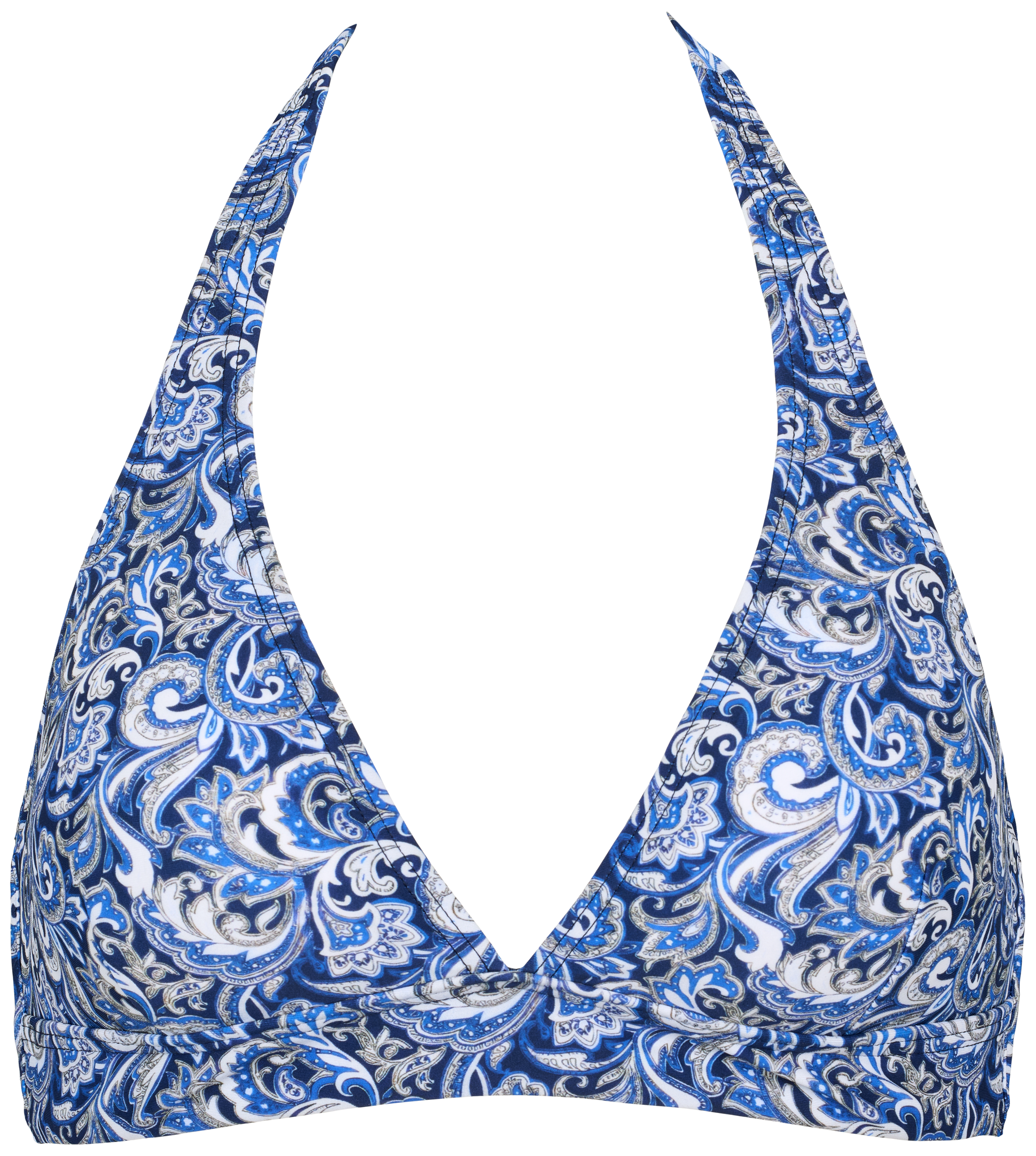 Denne Amber bikinioverdel fra Missya kombinerer et klassisk paisley-mønster med en funktionel pasform, der er ideel til ferien eller en tur i poolen. Bikinioverdelen er udført i en slidstærk kvalitet af 80% polyamid og 20% elastan, hvilket sikrer god elasticitet og holdbarhed i vandet. Designet er en halterneck-model, der bindes i nakken og lukkes med et spænde i ryggen, hvilket giver en stabil støtte. For et fuldendt look til strandturen kan denne overdel med fordel sammensættes med de matchende Amber bikinitrusser.