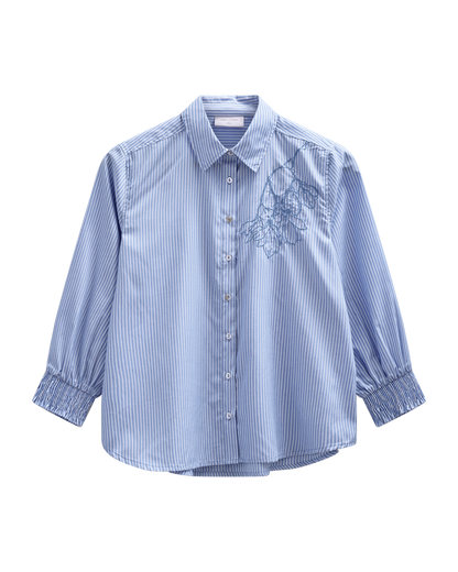 Her får du Evalina, en fin skjorte fra Freequent i en flot blå farve. Skjorten er lavet i en blanding af 70% polyamid og 30% bomuld, hvilket giver stoffet en let struktur. Det er en klassisk skjortemodel, der med sit print får et mere legende udtryk, som passer perfekt ind i din garderobe, hvis du leder efter noget andet end de helt ensfarvede overdele.