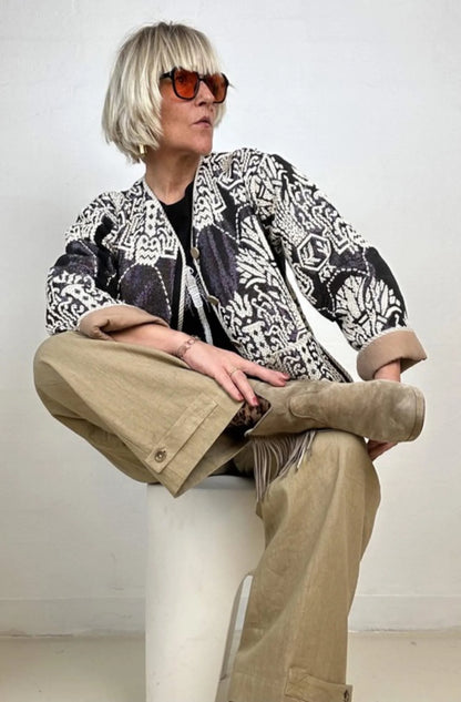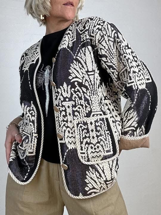 Marseille er en iøjnefaldende jakke med et markant sort og hvidt mønster, der giver masser af karakter til dit outfit. Jakken er konstrueret med en række knapper foran og har store, praktiske lommer, der er markeret med en lys kant. De brede ærmer har et opsmøg, der afslører en kontrastfarvet inderside, hvilket tilføjer en ekstra detalje til det samlede look. Den åbne halsudskæring og det strukturerede stof gør den velegnet som et let lag over dit tøj.