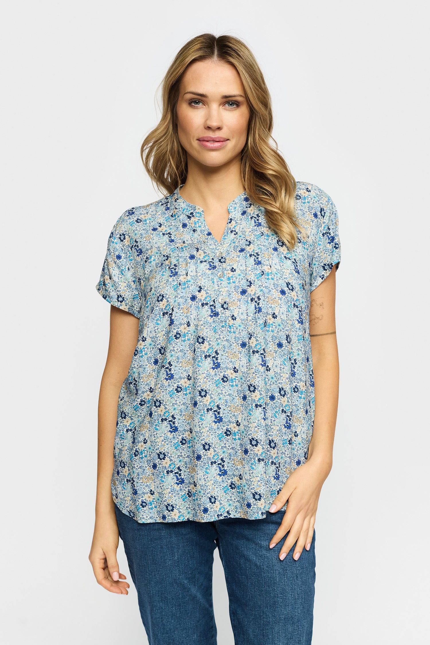 Kombiner blusen med et par mørkeblå jeans for at fremhæve de forskellige blå toner i printet til et gennemført hverdagslook. Du kan også bruge den sammen med en let nederdel på ferien, hvor de fine læg og det lette stof sikrer en flot figur. Blusens snit gør den nem at bruge både løsthængende eller stukket ned i et par bukser for at markere taljen.