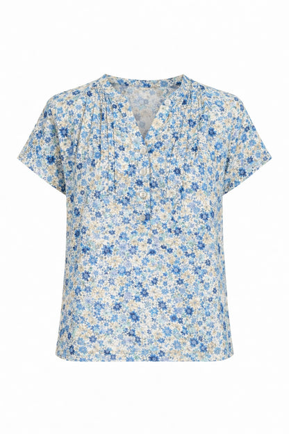 Bloome fra 2-Biz er en let bluse med et fint, småblomstret print i blå nuancer, der giver et friskt udtryk. Blusen har en klassisk stolpelukning med små knapper foran og fine læg ved brystet, som giver stoffet et flot fald. De korte ærmer og det enkle snit gør den ideel til de varmere dage, hvor du ønsker et feminint look uden at gå på kompromis med det enkle design.