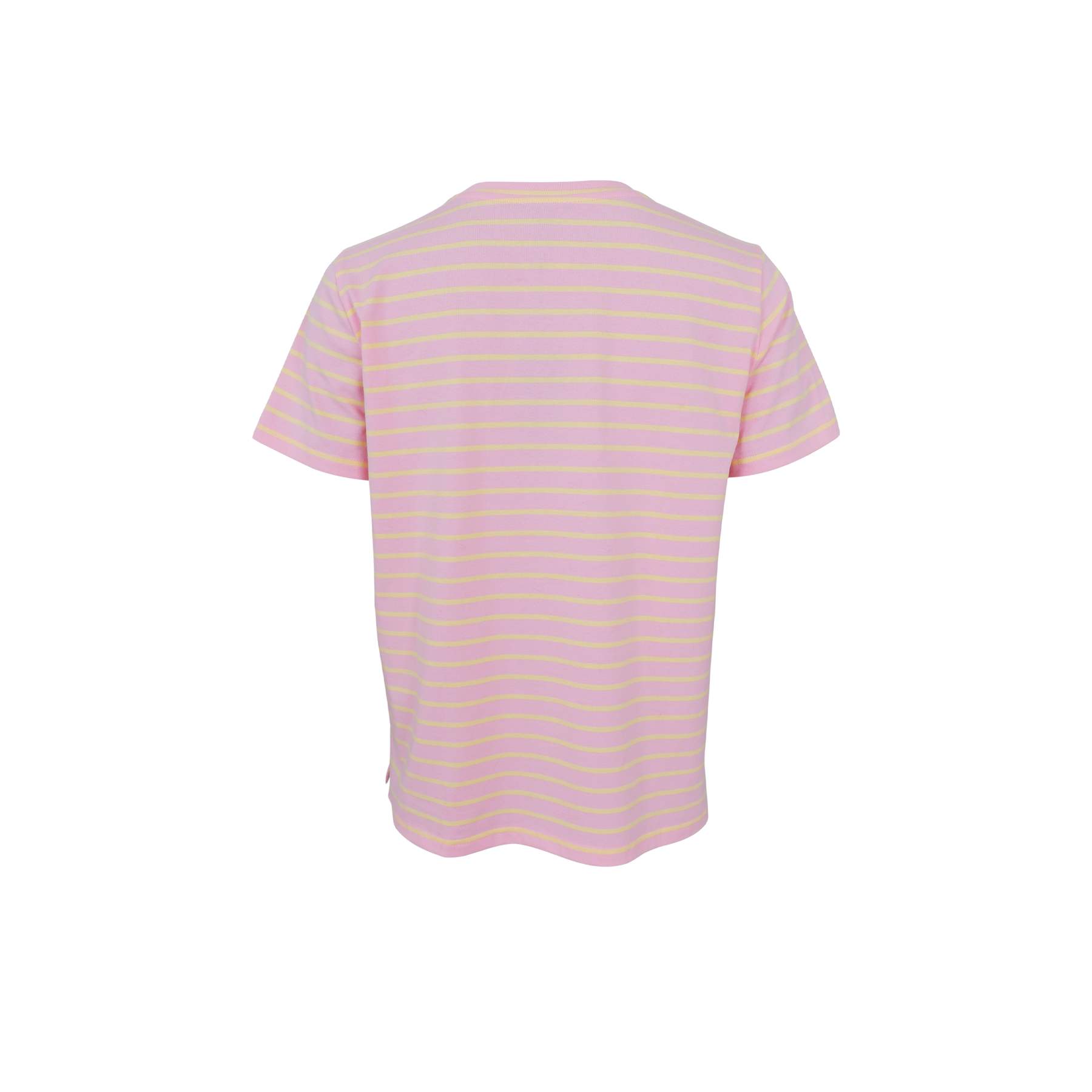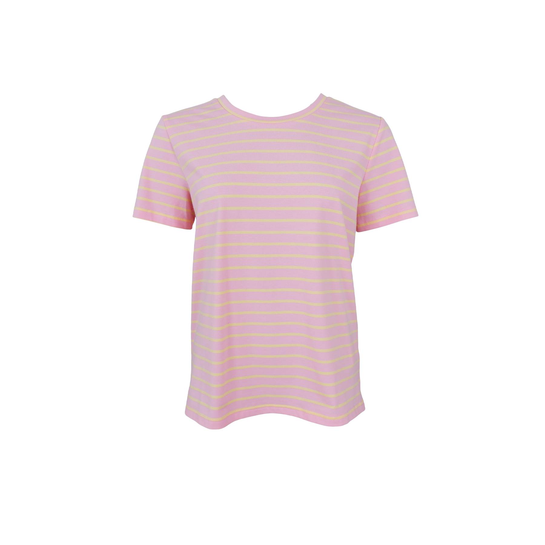 Maylee er en fin stribet T-shirt i farvekombinationen Candy/Yellow, der giver et friskt udtryk til din garderobe. T-shirten har korte ærmer og en klassisk rund halsudskæring, som gør den nem at bruge i mange forskellige sammenhænge. Det enkle snit og de vandrette striber i lyserød og gul skaber et legende look, der passer perfekt til de lysere måneder.