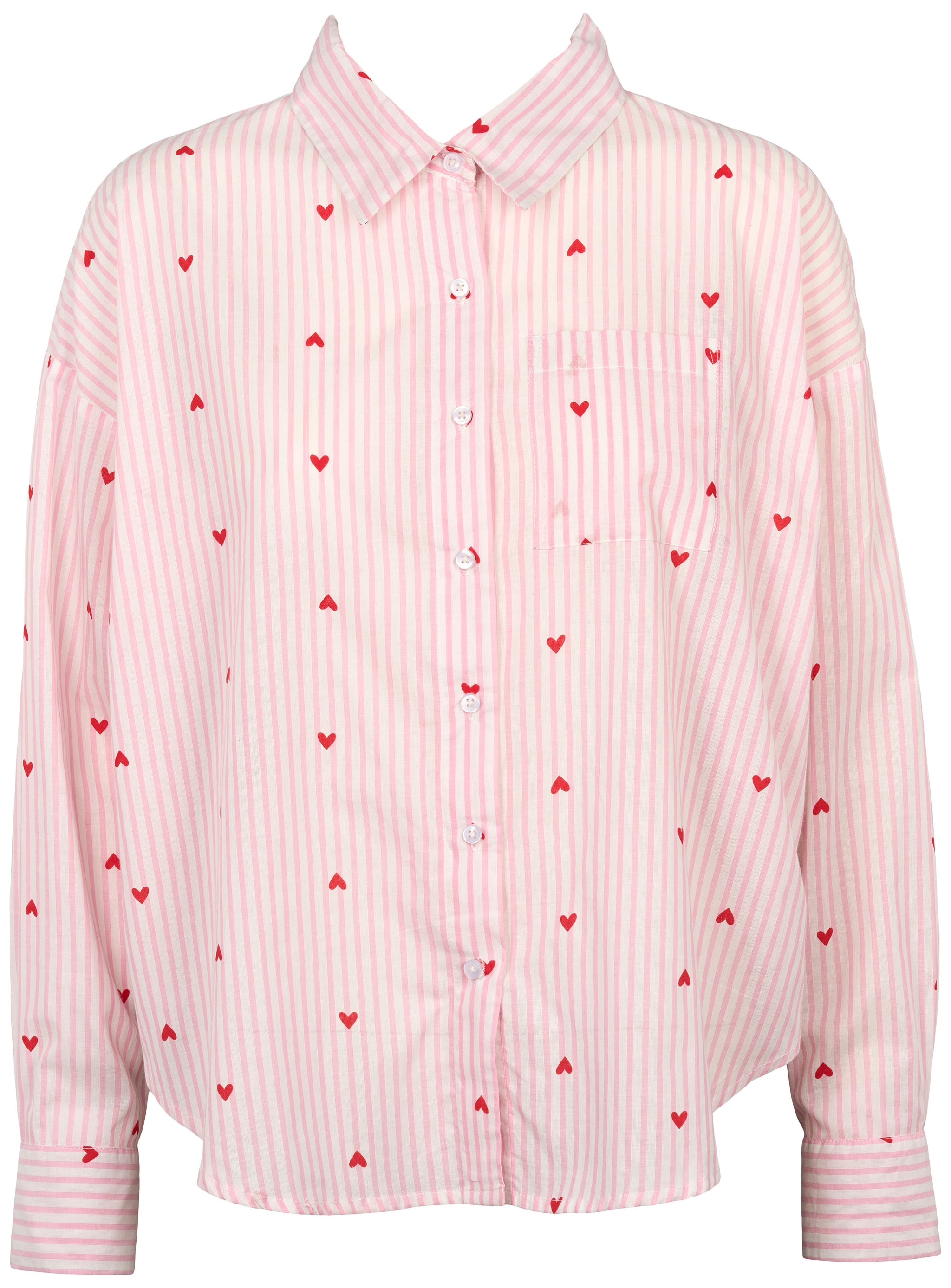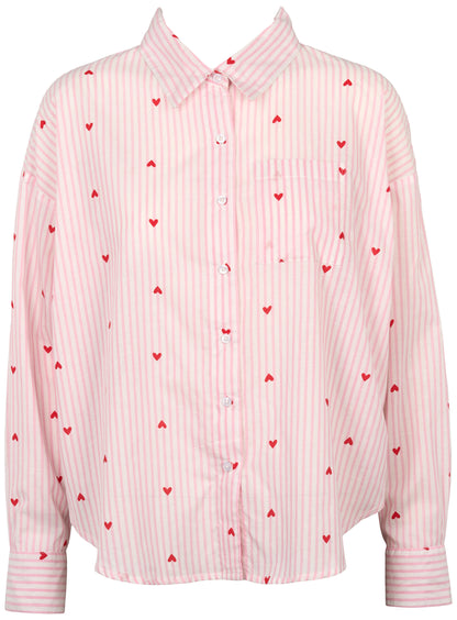 Anna er en klassisk natskjorte fra Missya i en fin lyserød farve med hvide striber og et fint print af små røde hjerter. Natskjorten er lavet i 100% bomuld og har en gennemknappet forside med hvide knapper, der matcher de fine striber. Den er designet med en traditionel krave og lange ærmer med manchetter, hvilket giver den et gennemført skjorte-look. Den løse pasform og det bløde materiale gør den velegnet til afslapning derhjemme.