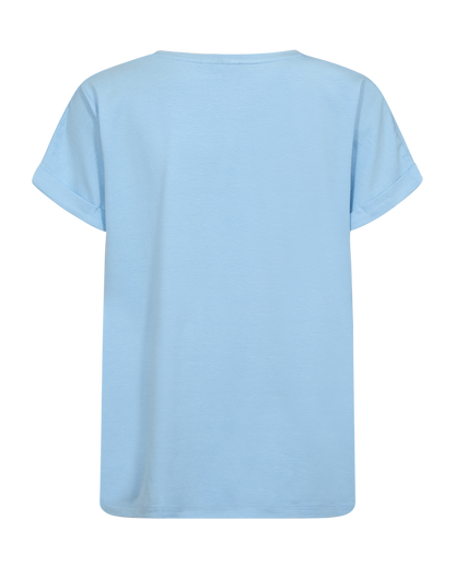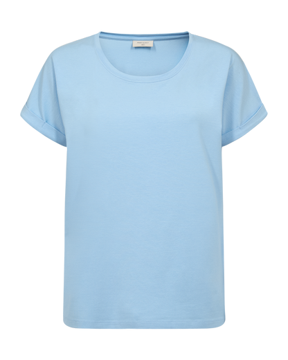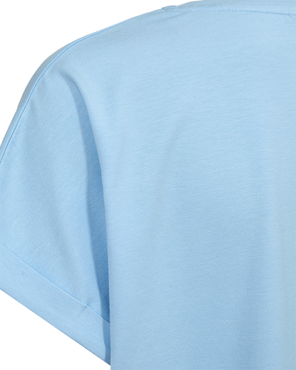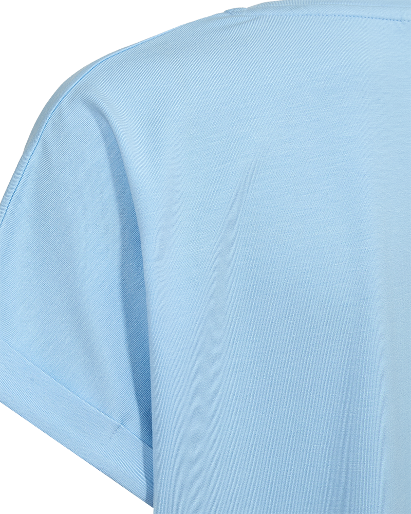 Brug T-shirten sammen med et par klassiske mørkeblå jeans for at skabe et roligt og sammenhængende hverdagslook. Du kan også kombinere den med en mønstret nederdel eller et par lette shorts på de varmere dage, hvor den lyseblå farve virkelig kommer til sin ret. Det bløde materiale og de enkle detaljer ved ærmerne gør, at den fungerer godt både alene og under en åben skjorte eller en let jakke.