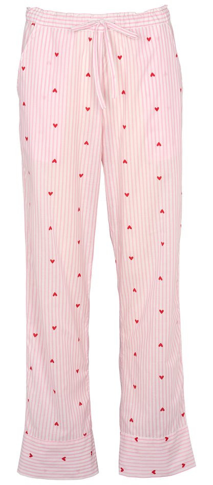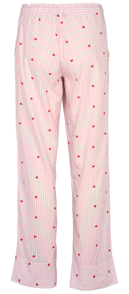 Anna fra Missya er et par klassiske natbukser i en fin lyserød farve med hvide striber og små røde hjerter. Bukserne er lavet i 100% bomuld, hvilket giver et naturligt udtryk til dit hjemmetøj. De har en elastik i taljen med et bindebånd foran, så de kan justeres efter behov. Det enkle snit med lige ben afsluttes med en bred kant forneden, der giver bukserne en flot form.