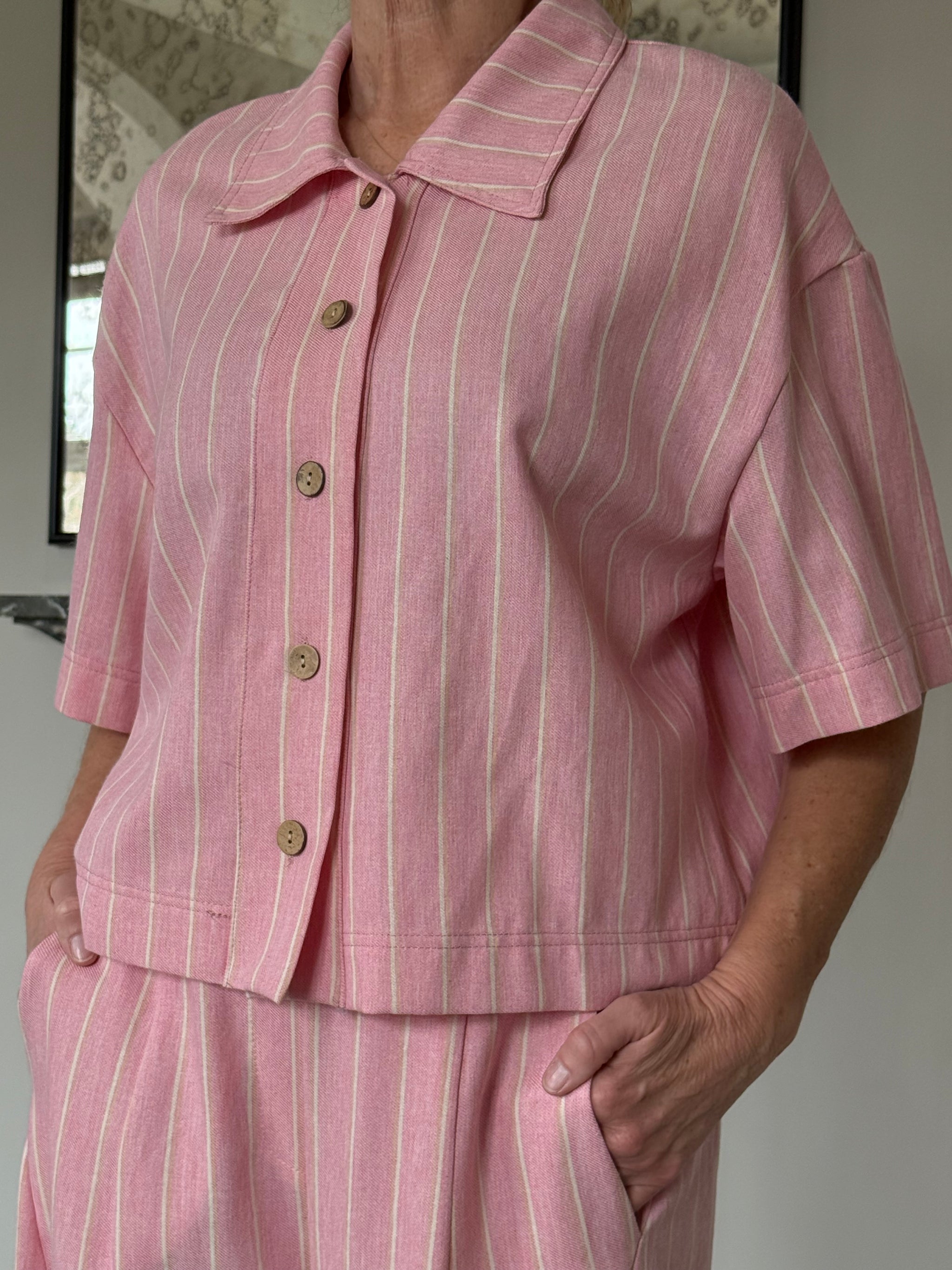 Abella er en fin jakke fra Marta du Château i en frisk lyserød farve med smalle, hvide striber. Jakken er lavet i en blanding af bomuld, viskose og polyester, hvilket giver stoffet en tydelig struktur. Den har et klassisk snit med knapper foran og praktiske brystlommer, der understreger det afslappede look.