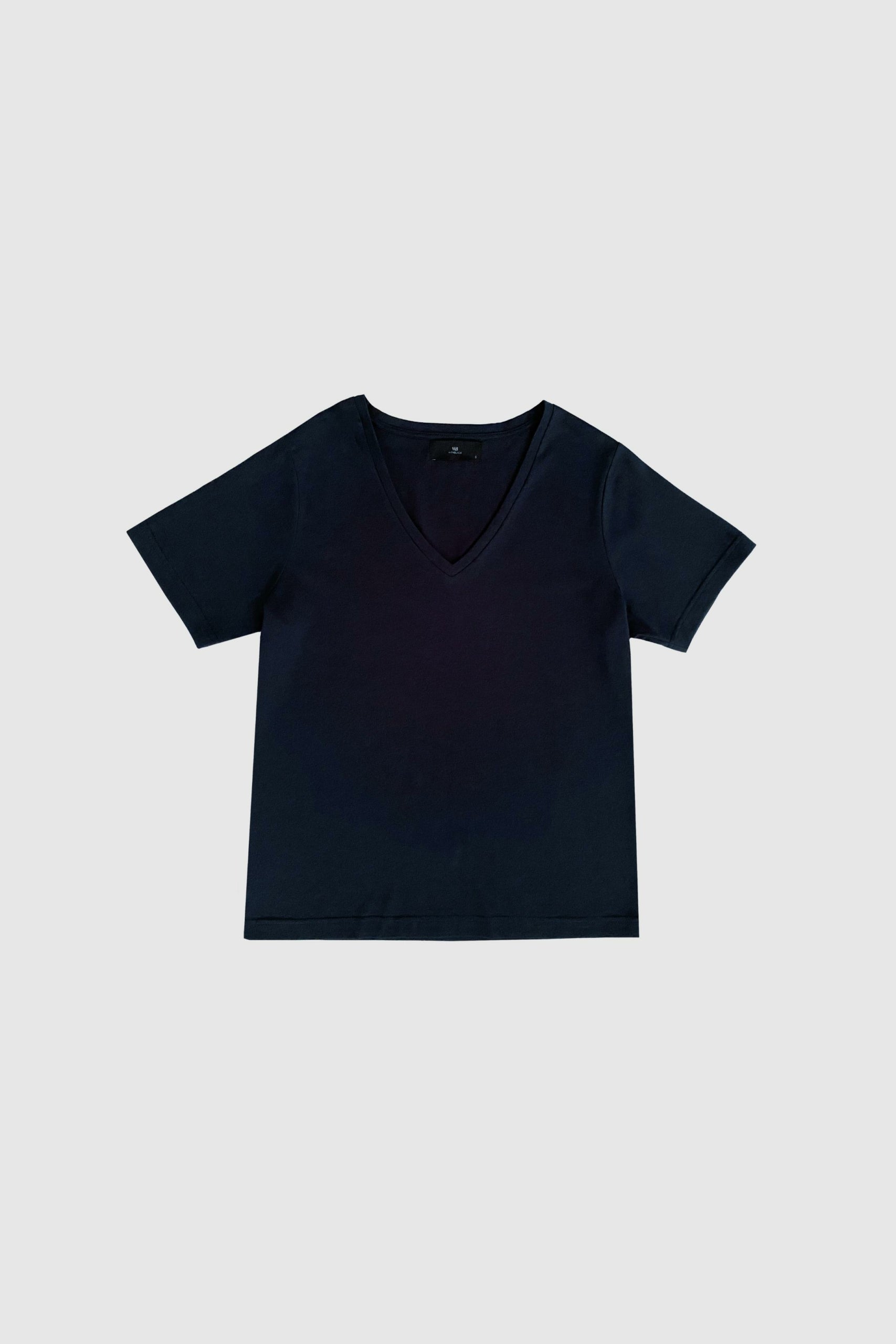 Gabrilla fra WithBlack er en klassisk T-shirt i en dyb mørkeblå farve, som er nem at bruge i mange forskellige sammenhænge. Den er lavet i 100% bomuld og har korte ærmer samt en enkel V-udskæring, der giver et rent og ukompliceret udtryk. Det enkle snit gør den til en god basisdel, der passer ind i de fleste garderober.