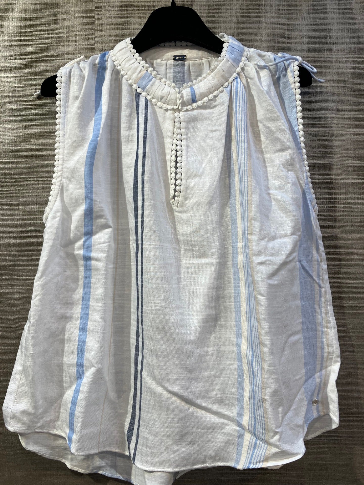 Aisa er en let top fra Gustav, der skiller sig ud med sit fine stribede mønster i blå nuancer. Toppen er uden ærmer og har en række fine detaljer, herunder en flæsekant ved halsen prydet med små hvide perler eller pom-poner, som fortsætter ned langs den lille åbning foran. Materialet består af en blanding af bomuld og viskose, hvilket giver stoffet en naturlig struktur. Den har et løst snit, der gør den ideel til de varme dage.
